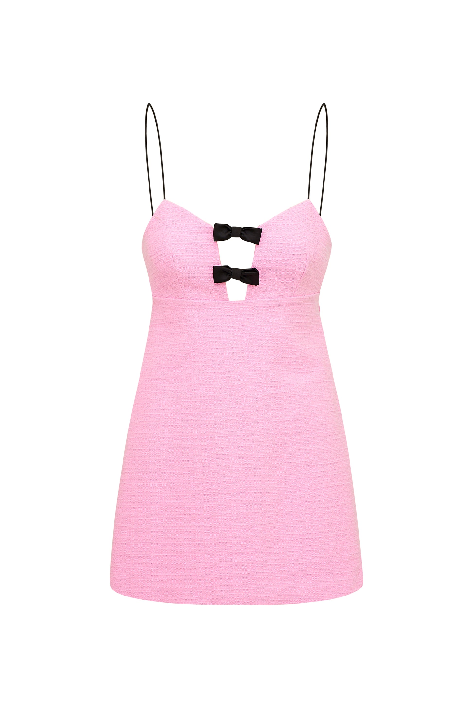 Sophistication meets femininity in the Adelaide Dress. This mod party dress arrives in a crisp, tweed fabric and a flattering silhouette. The A-line mini begins with spaghetti straps that fall to a keyhole detail highlighted by dainty, flirty bows at center front. She’s our new favorite party dress.