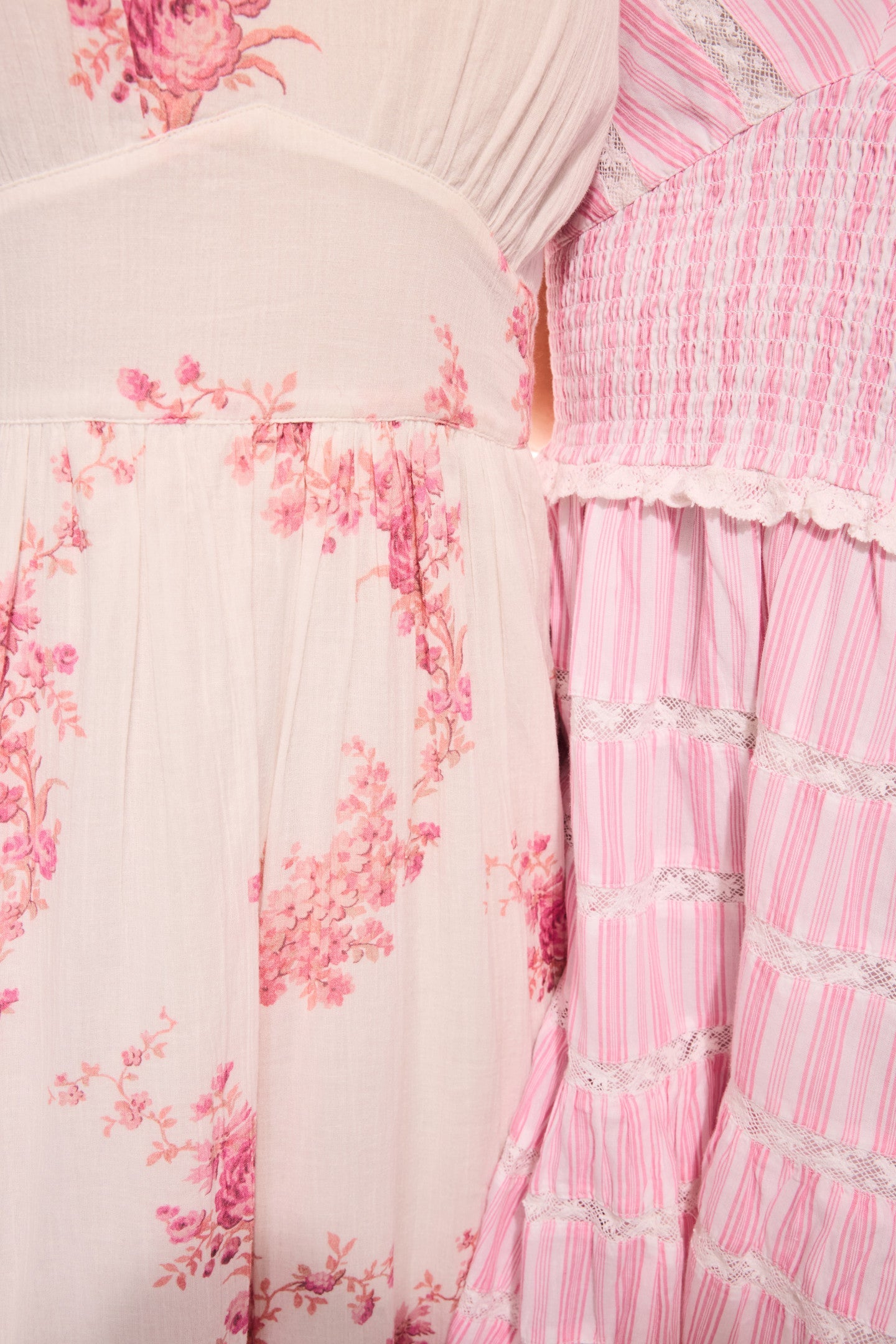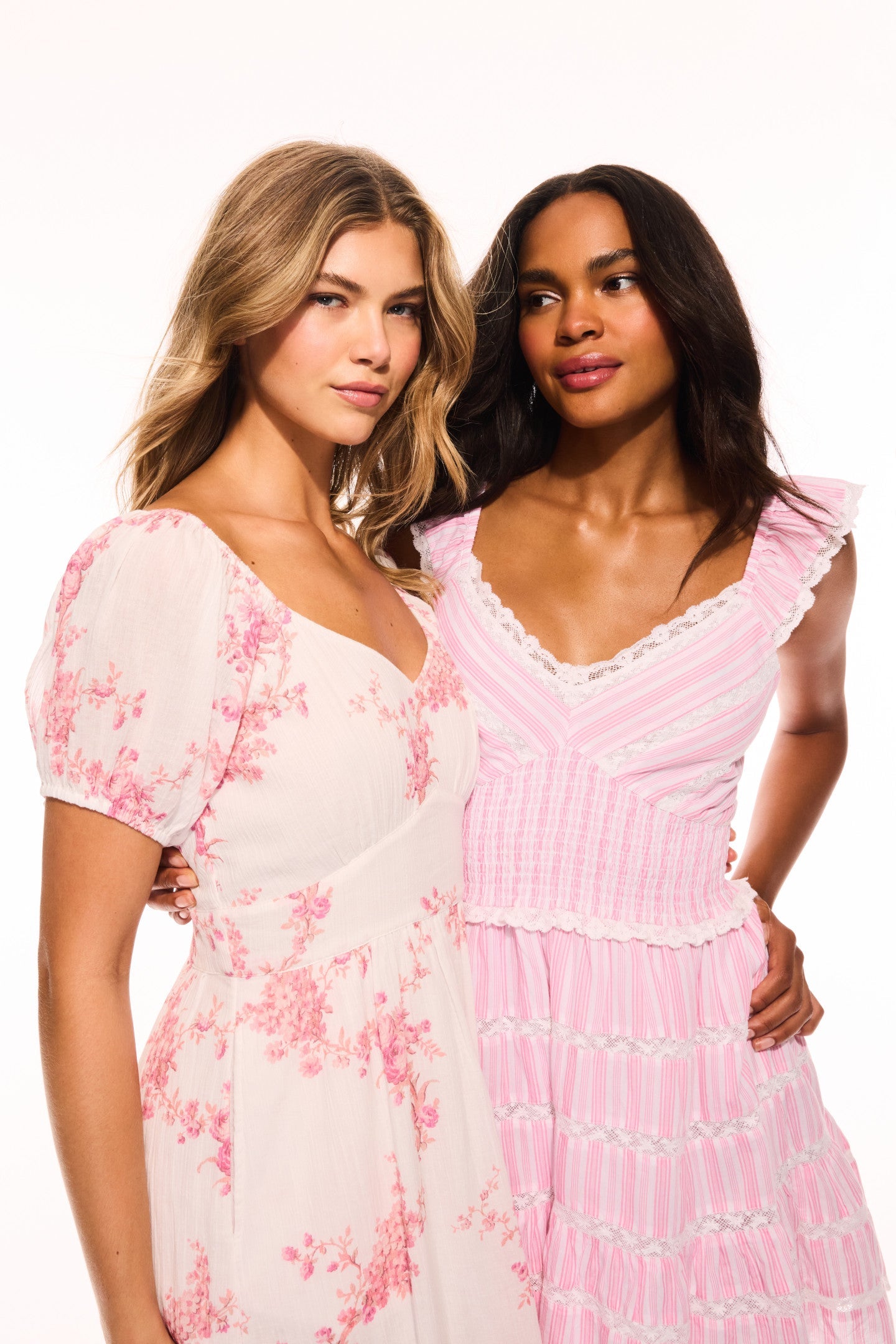 The Angie Dress returns as part of our Upcycled Icons Collection, a limited-edition sustainable capsule featuring our best-selling silhouettes made from remnant LoveShackFancy fabrics. This charming mini is designed with an easy and airy silhouette with short puff sleeves, an open neckline, and a multi-tiered skirt.