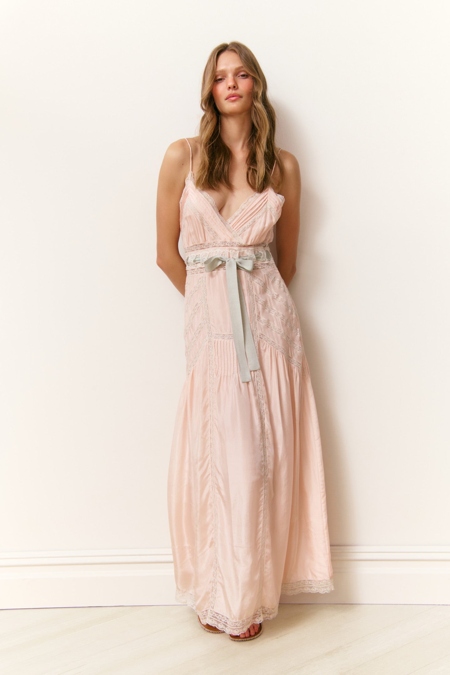 Introducing the Arlissa Dress. Designed from a luxe silk habotai fabric, the lightweight, Bohemian-inspired maxi features a straight silhouette that’s fitted throughout the hip which then releases into a modest A-line skirt. A grosgrain ribbon is threaded around the waist, the front features an overlap detail, and the piece is lined with a polly georgette fabric.