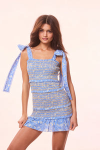 Part of our Re-Edition Collection, our original Belle Dress returns with our signature Windsor Rose print all over. This playful mini stuns with intricate details like tiny tiered ruffles throughout and zigzag embroidered florals all over. A smock bodice and self tie bow straps give this piece a flattering and feminine silhouette.