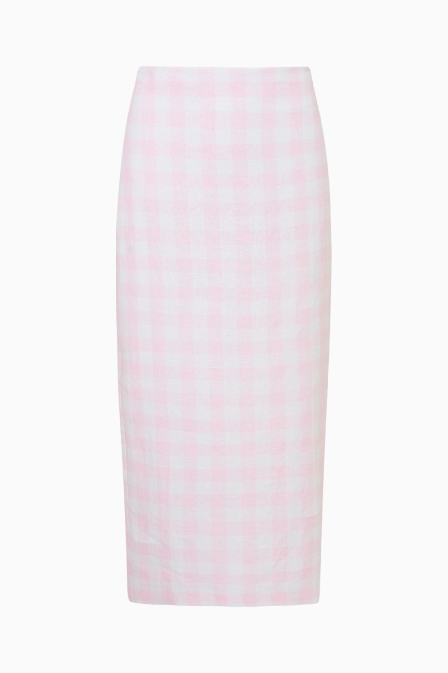 Pretty in pink in the Biselle Skirt. This charming midi debuts with a crisp linen fabric featuring a coastal gingham print all over. With a fixed waist, the pencil skirt has a center back slit and a flattering, form-fitting silhouette. Pair with the Amorana Top for the full set.