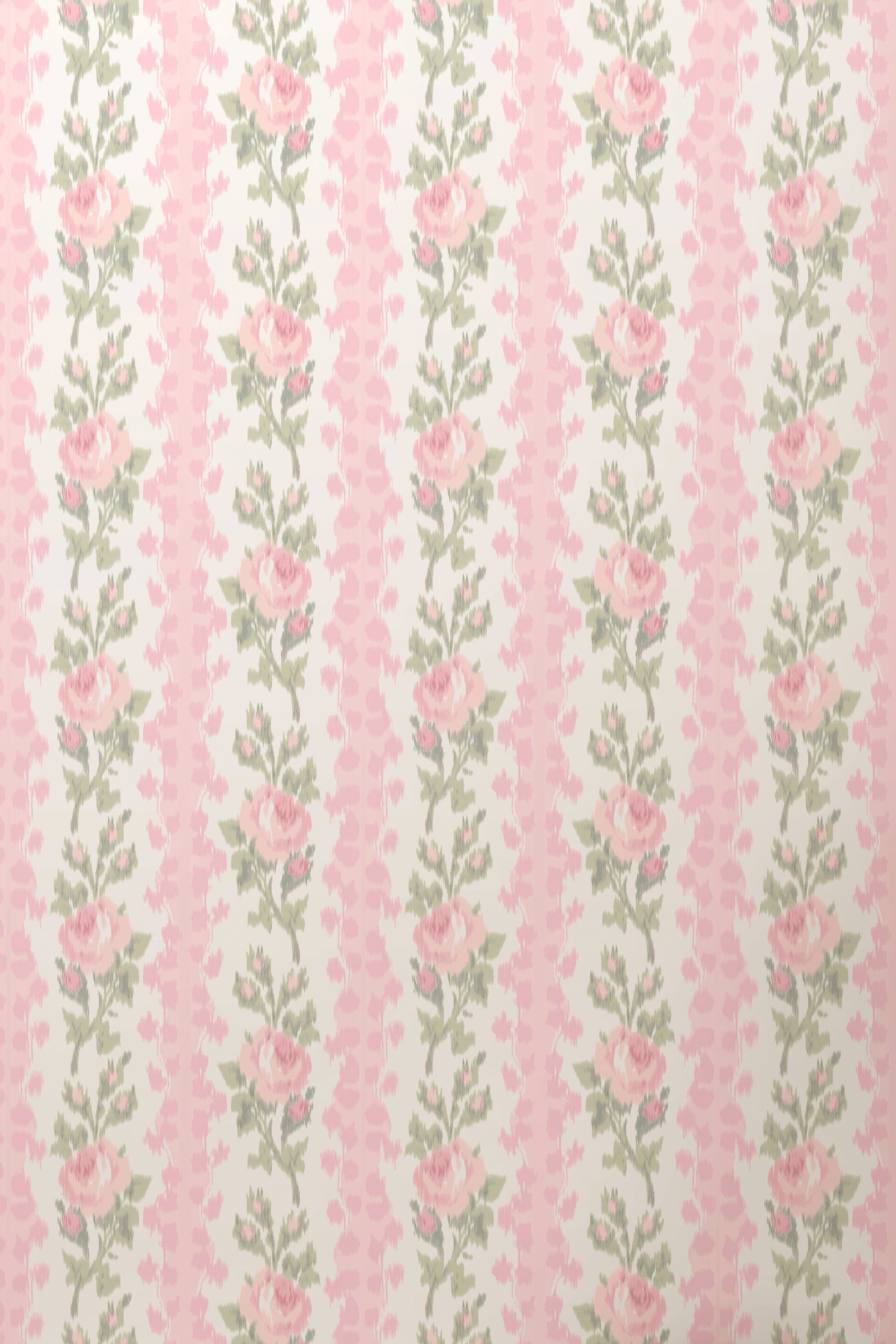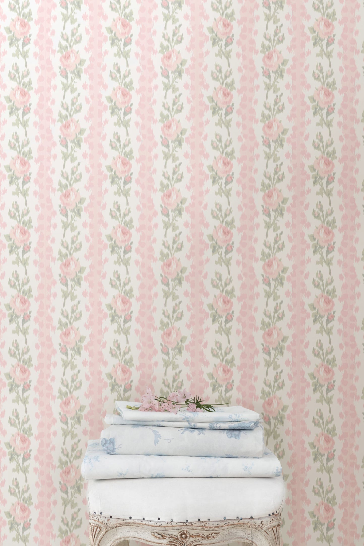 Wrap your walls in sweetness and elegance with this floral wallpaper. Vined columns of pink roses bloom extravagantly against a cream-colored backdrop. Each roll measures 20.5” x 33'.