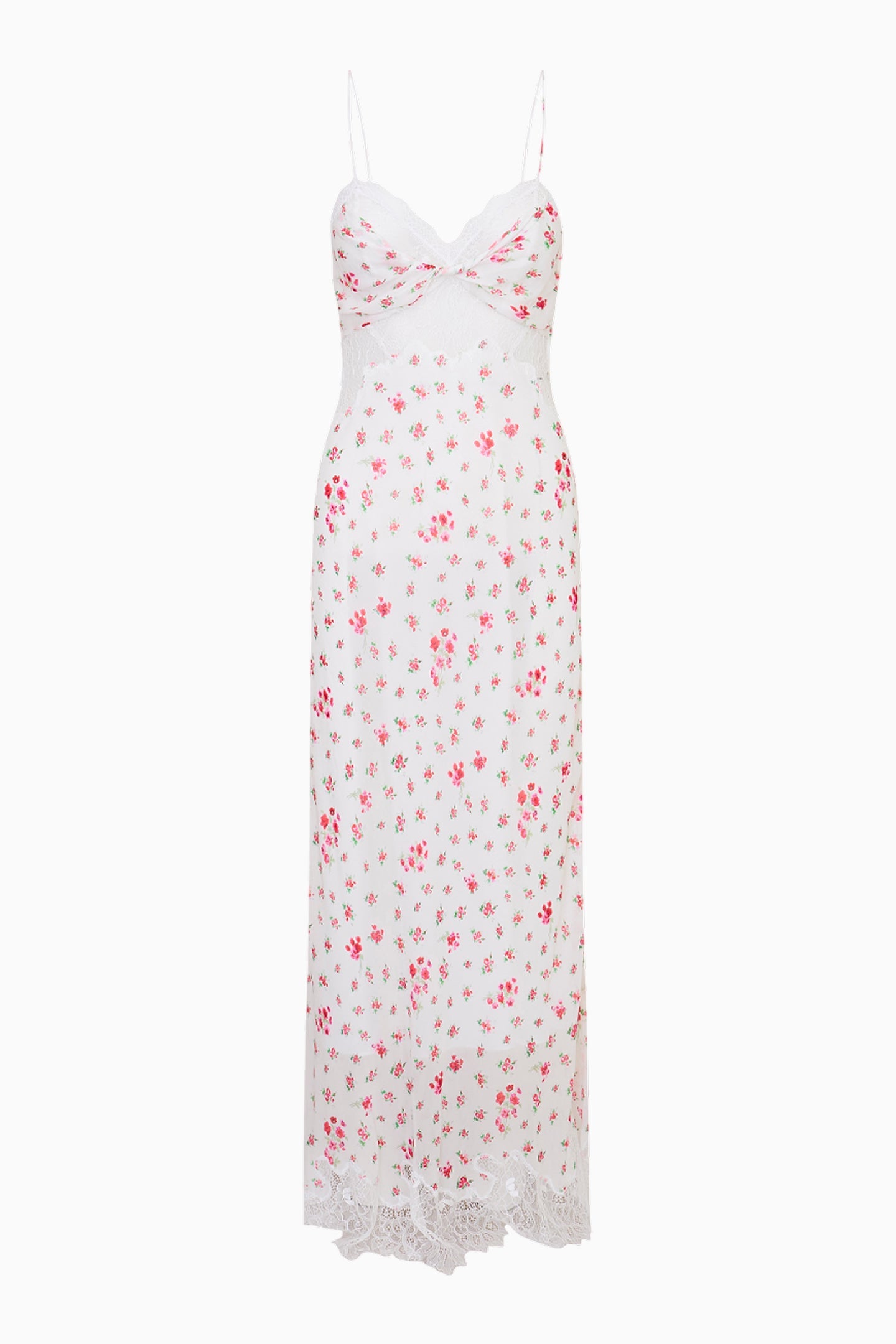 Feeling flirty in the Bristelle Dress. This cami slip dress debuts in a viscose chiffon fabric featuring spirited bouquet prints that have been inverted to an All-American red-and-white colorway. The midi has spaghetti straps and a twist draping detail at the bust that falls to a layer of chantilly lace at the bodice over the draped chiffon. With a bias cut, this dress is slinky and easy-to-wear. The dress is finished with chantilly lace at the hem.