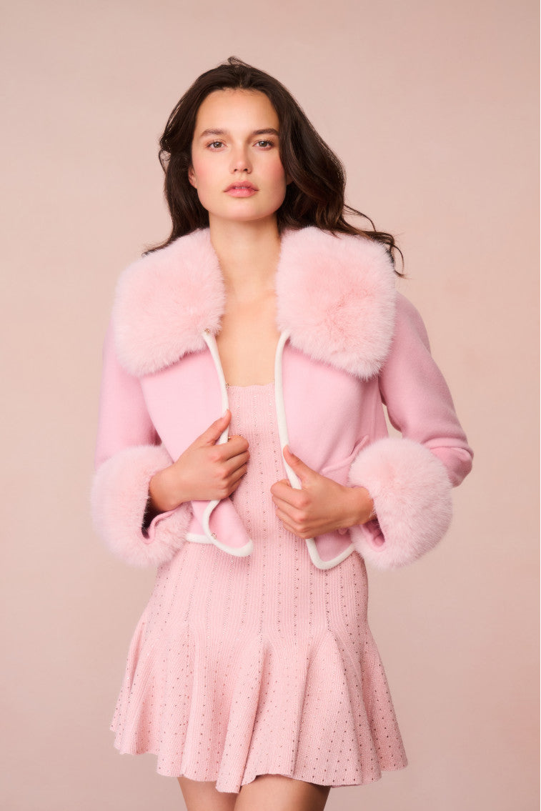Introducing the Caprina Jacket. Designed from a soft and sustainable double face wool, this Upper East Side-inspired jacket arrives with a cozy but elevated look and feel. Contrast details, rounded pockets, and sweeped, curved edges give this layer a feminine shape. The stunning outerwear gets a playful touch with faux fur on the collar and cuffs.