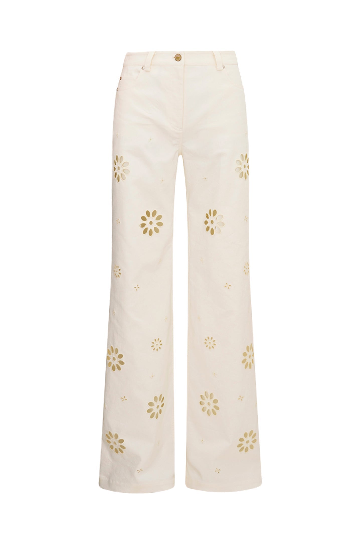 Introducing the Carolette Pants. Debuting with a slight stretch twill fabric, these medium-weight pants are our new warm weather go-to with a sheer, large-scale floral eyelet detail all over. A slightly longer pant and a flare shape give these pants a 70s-inspired look. The bottoms include multiple different pocket shapes – a back patch pocket, a front slant pocket, and a coin pocket. The pants have a center front zip up at the fly, belt loops, and a metal shank at center front.
