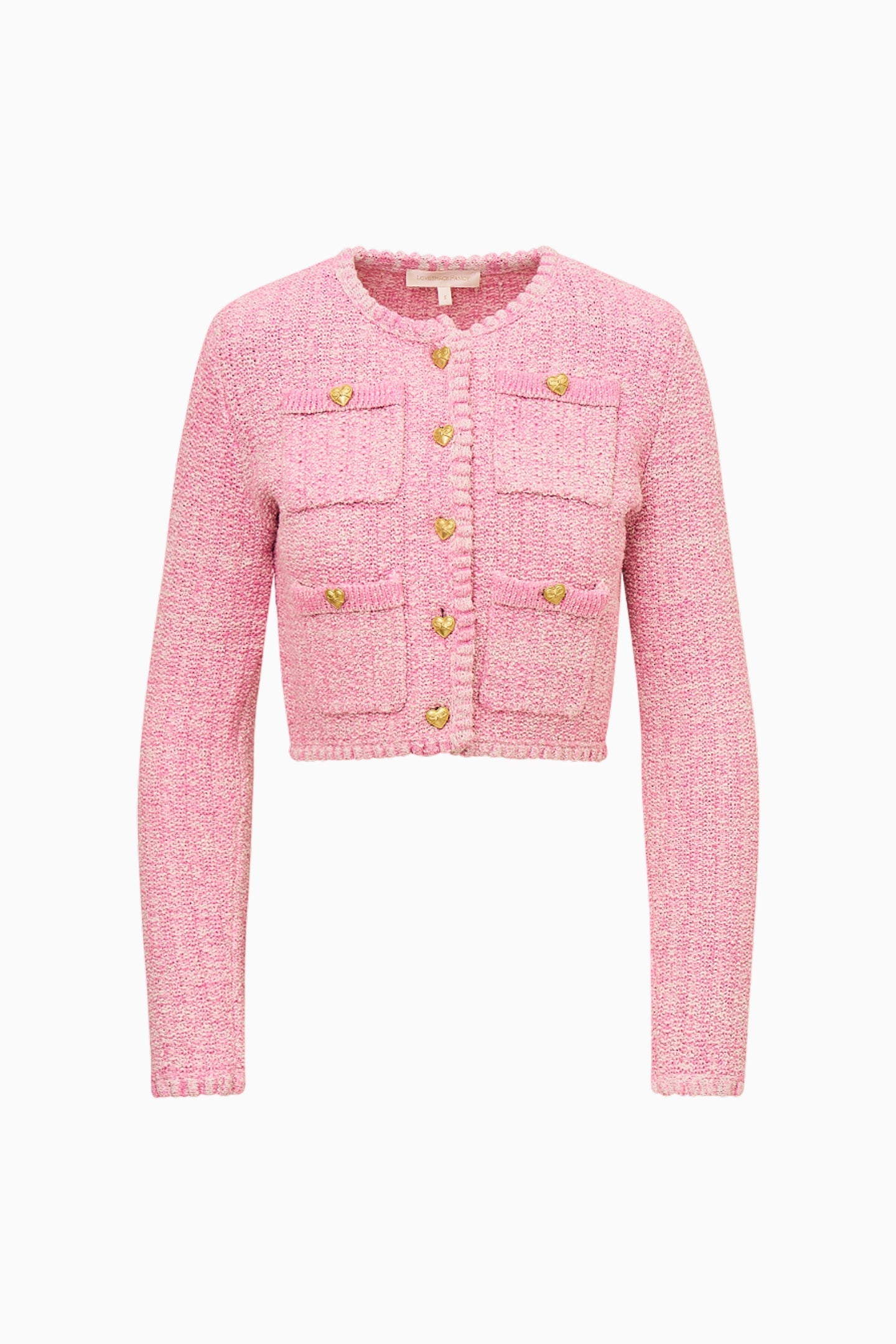 The Delcie Cardigan arrives for the fall. with Knit in a textured tweed stitch with a soft melange of white-and-pink cotton yarn with lurex shimmer. Structured with subtle shoulder pads, this polished yet playful layer is finished with custom heart buttons, functional pockets, and a sweet bobbly trim along the body and sleeve edges. Romantic and timeless, Delcie is a forever favorite to style on its own or paired back to the matching skirt, Ellianna Skirt.