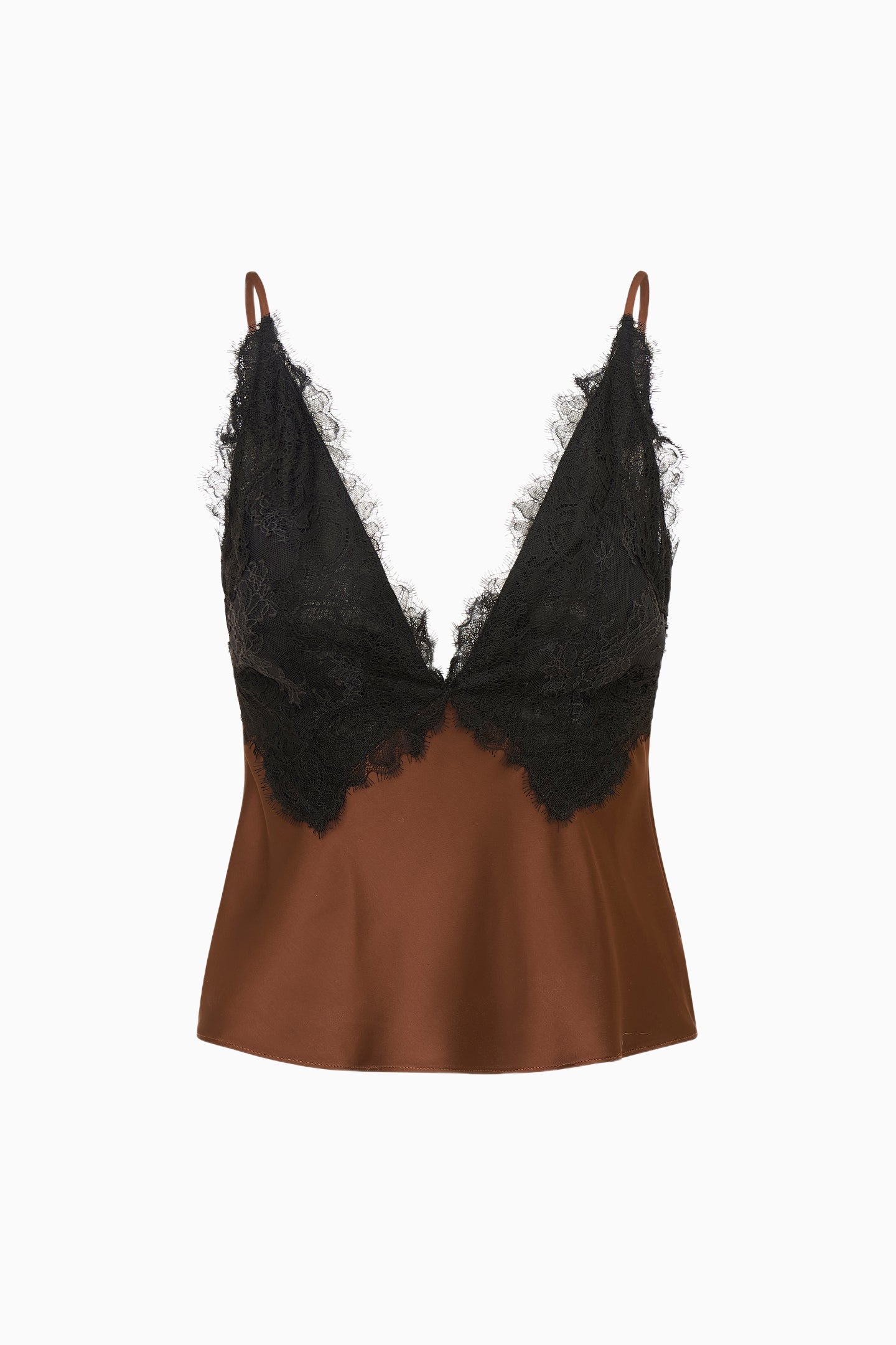The Elloryn Top brings an easy elegance in satin charmeuse with a graceful drape. Cut on the bias for a flattering fit, this cami features a plunging V-neckline with delicate contrast lace appliqué at the bodice. Slim spaghetti straps and a back zipper complete this timeless piece, perfect for layering or wearing on its own. Pair with the Calder Skirt for a full set.