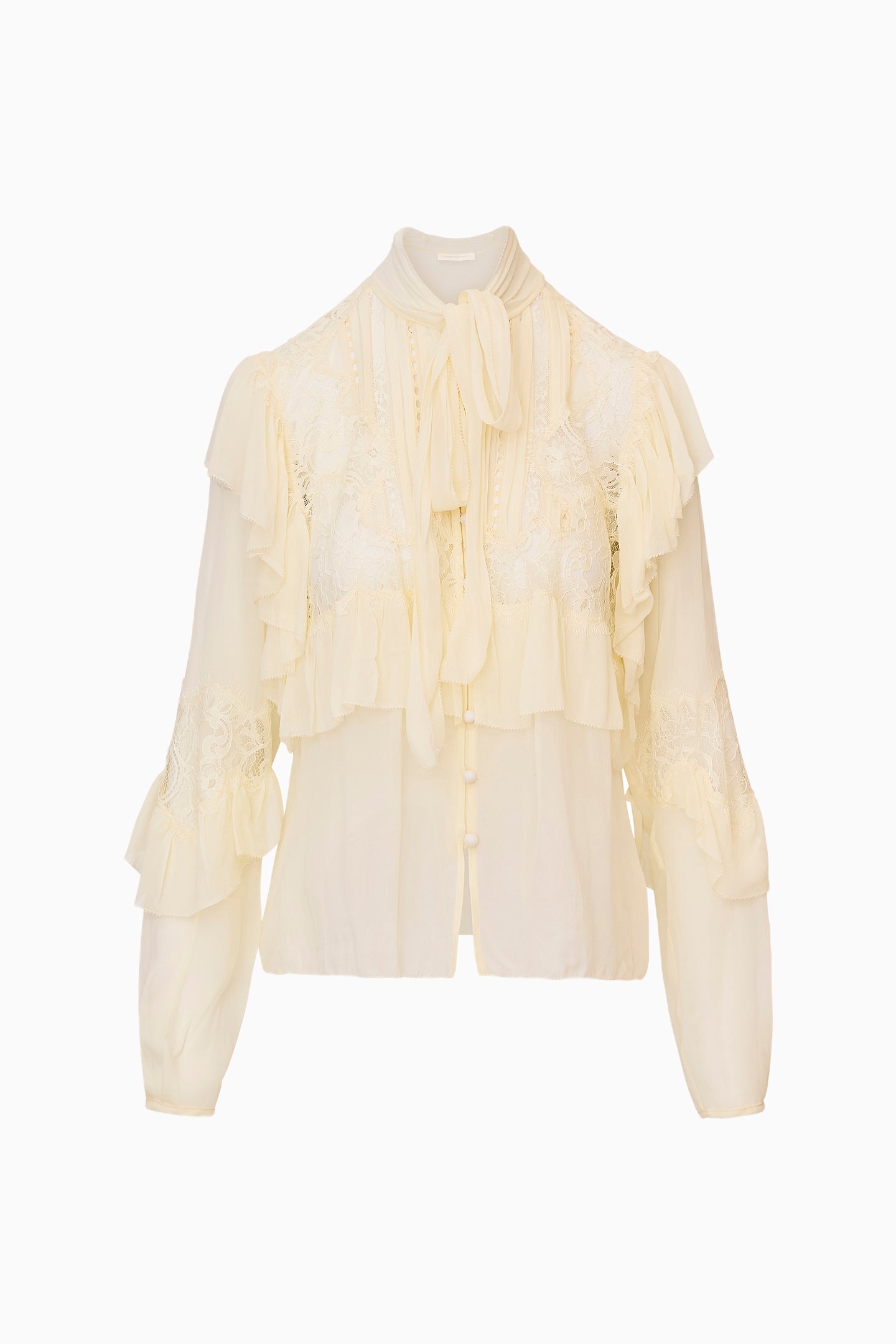The Farah Top is a study in Bohemian-inspired romance, cut in airy viscose georgette with a cascade of ruffles that feel undeniably dreamy. This button-down blouse features a delicate loop closure at the front and a dramatic sleeve, where ruffles tumble from the shoulder to the elbow in signature LoveShackFancy fashion. A sheer lace yoke opens at the neckline for a sultry touch—perfectly wearable with a bra beneath—while a built-in bow sash can be tied at the front for a sweet finish or left undone for a flirtier edge. Lightweight and unlined, Farah is the ultimate bohemian blouse, equally chic tucked into denim or dressed up for evening.