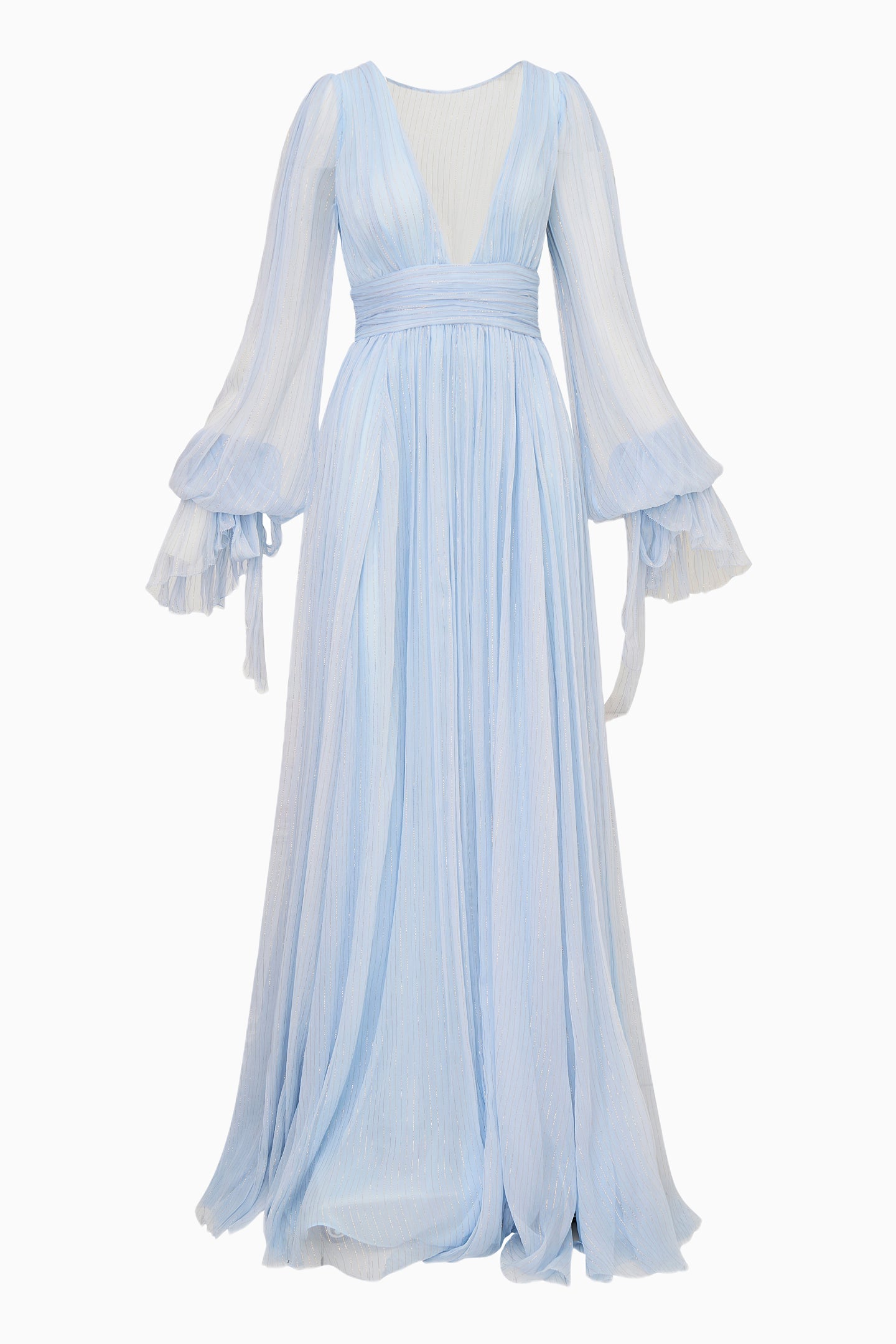 Make an entrance in the Galatea Dress, designed in our luminous dusk lurex chiffon — a luxe blend of silk and metallic that shimmers with every step. This true evening gown channels bohemian glamour with a plunging deep V-neckline, ruched waistband, and a shirred, sweepy skirt that moves effortlessly. Billowy blouson sleeves finish in tieable cuffs for a romantic touch, while a thigh-grazing slit on the wearer’s left adds a hint of flirtation. Fully lined through the body with sheer sleeves; finished with a concealed zipper at the back.