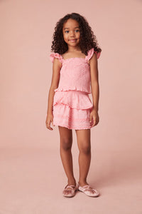 Forever sweet in the Caspia Top. Our little loves stun in this easy, warm weather top featuring tiny flutter sleeves with a ruffle, smocking all over, and a dainty ruffle peplum hem. Pair with the Albion Skirt for a full look.