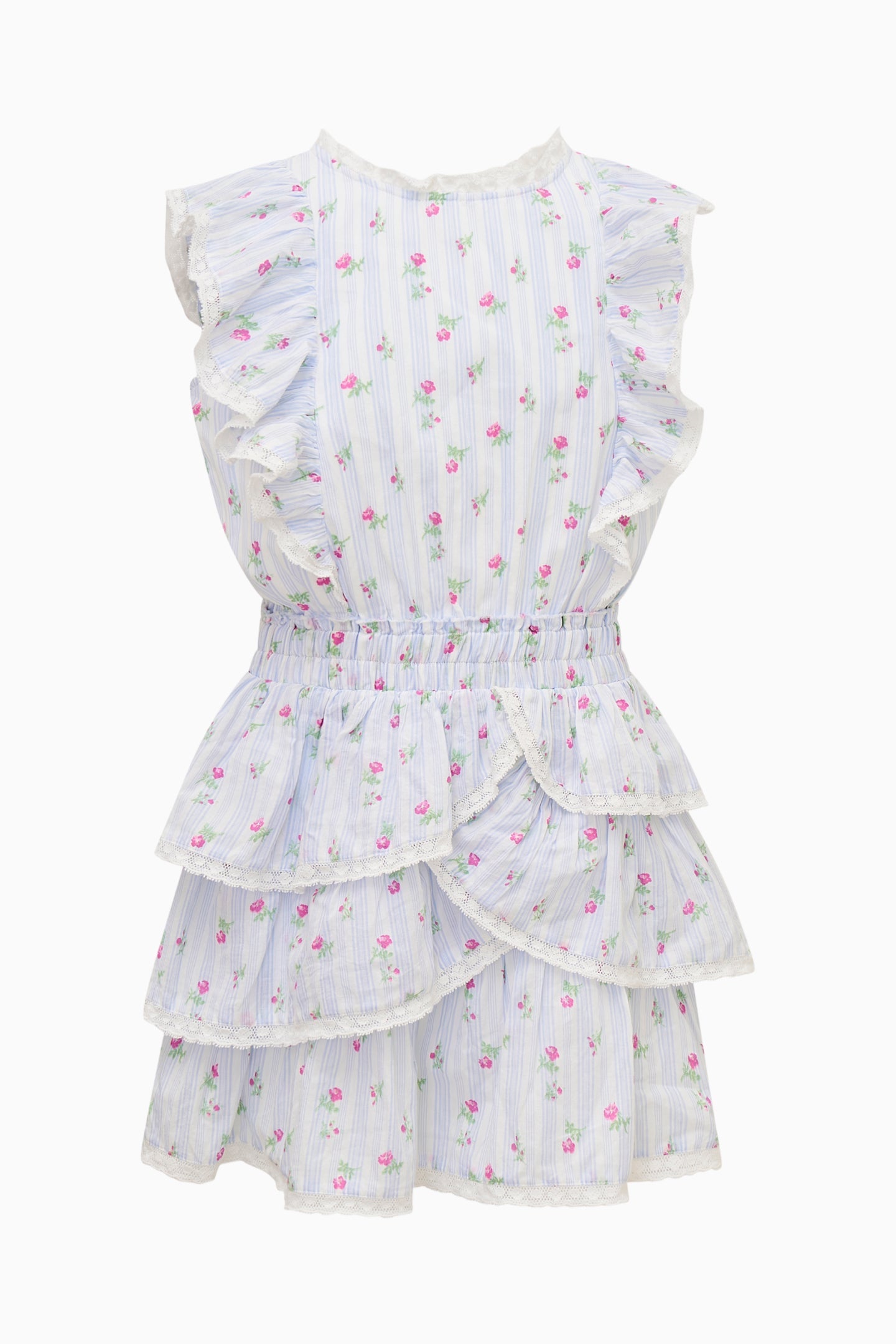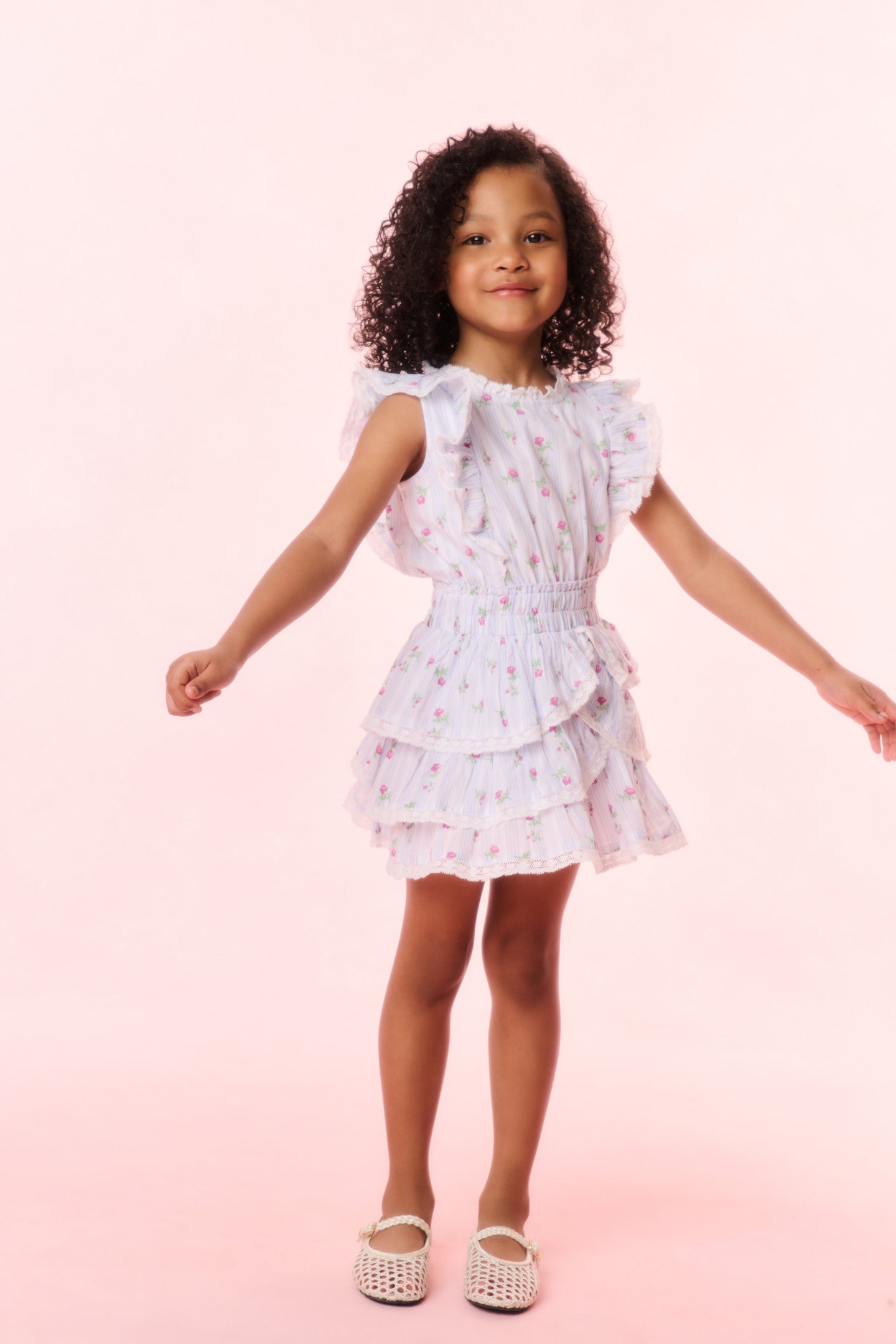 Meet our Decker Dress for girls in 100% cotton with custom lace. This easy frock has a ruffle-trimmed collar, buttons down center front, flutter sleeves, an elastic waist and overlapping asymmetrical ruffles at the skirt.