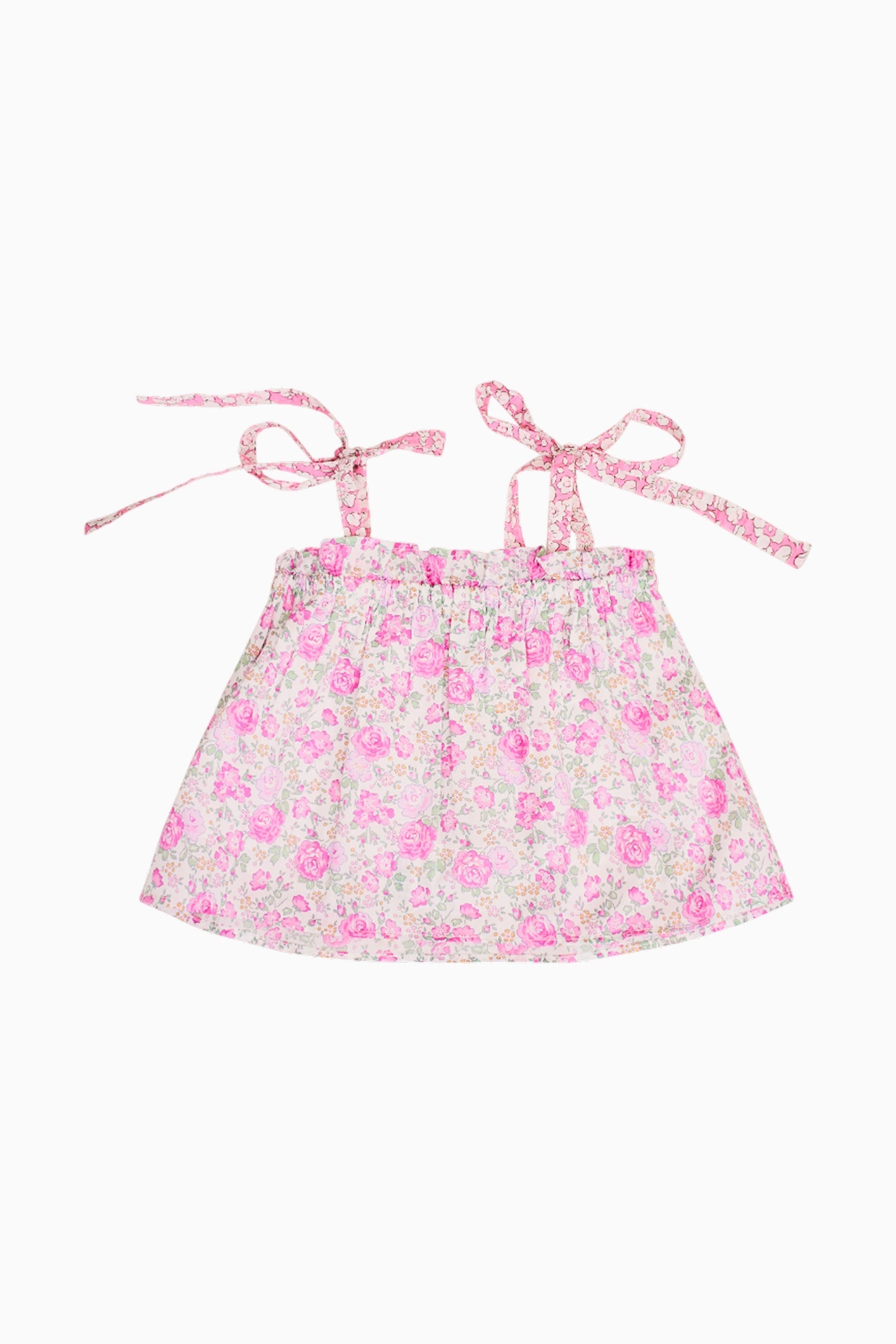 Introducing our latest capsule collection Made with Liberty Fabrics designed into our favorite elevated pieces.The Fiorella Top returns in Liberty's Tana Lawn™ cotton fabric with a floral print all over. This pretty sunshine piece features thin straps with a bow detail, an eyelet neckline, a large bow embroidery, and a scalloped hem with eyelet detail.