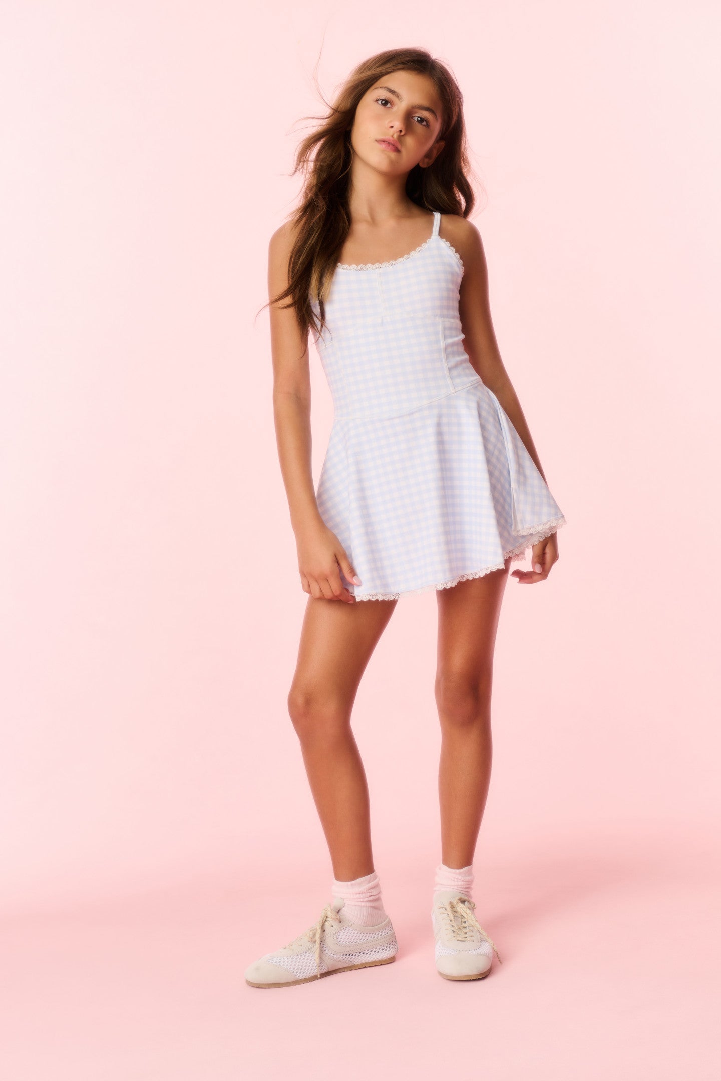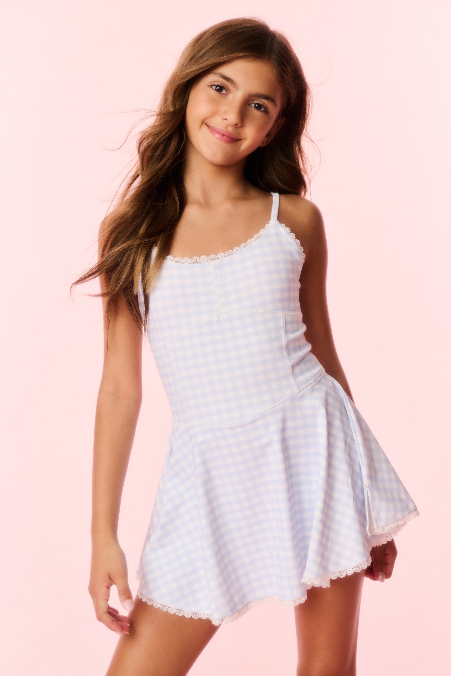 Our girls are sporty and cute in the Kishori Dress. This pretty piece is designed from our lightweight, breathable active fabric and features built-in shorts, removable bust cups, side pockets, adjustable straps, side slits, and lace trim at the neckline, armholes, and hem.