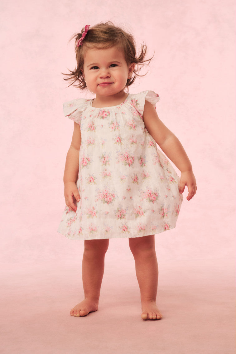 Skip along in our Lou Dress, easy in lightweight crinkle gauze. An incased ribbon ties in a bow at the circle neck, framed by flutter sleeves. The roomy bodice falls into a sheath silhouette, stopping above the knee.