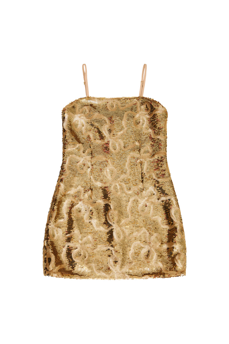 Introducing the Marin Dress, for the girls who love to shine. This pretty party dress stuns with glistening sequins all over. The piece begins with thin, spaghetti straps above a high neckline that falls to a body-skimming skirt.