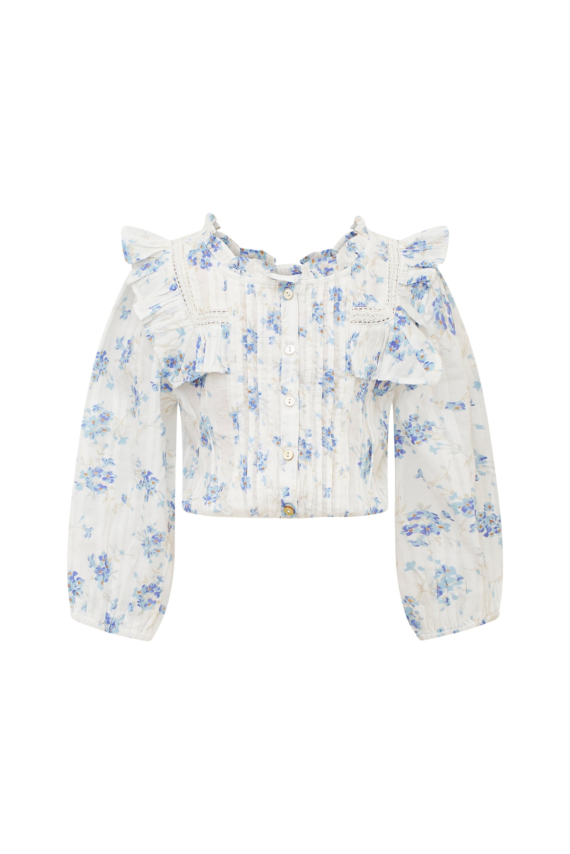 Our Oda Top returns for our little loves in 100% cotton in our dainty blue floral print. This easy, transitional blouse features intricate custom lace detail at the round neckline and throughout the ruffle-adorned bib, airy long sleeves and small embroidery detail all over.