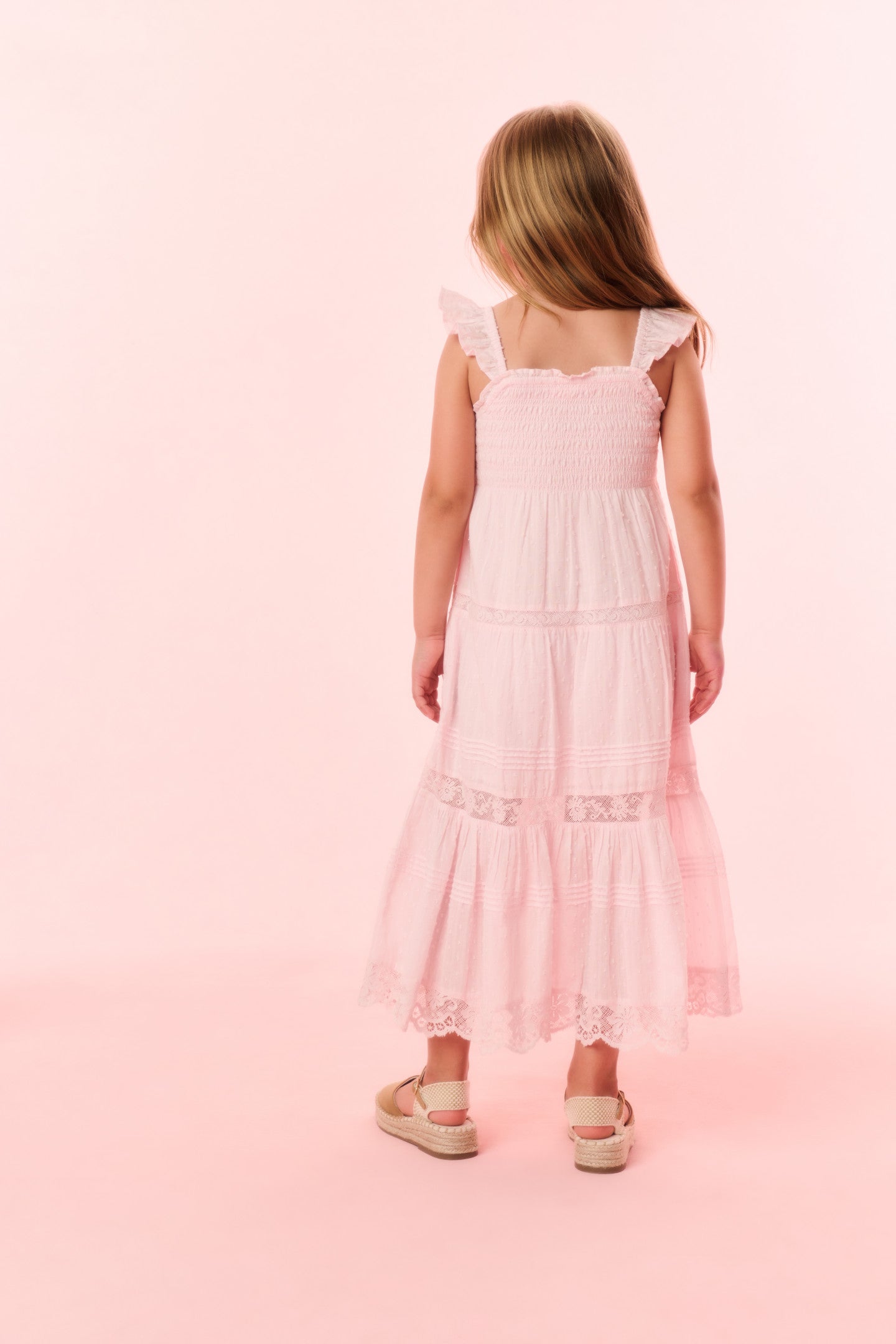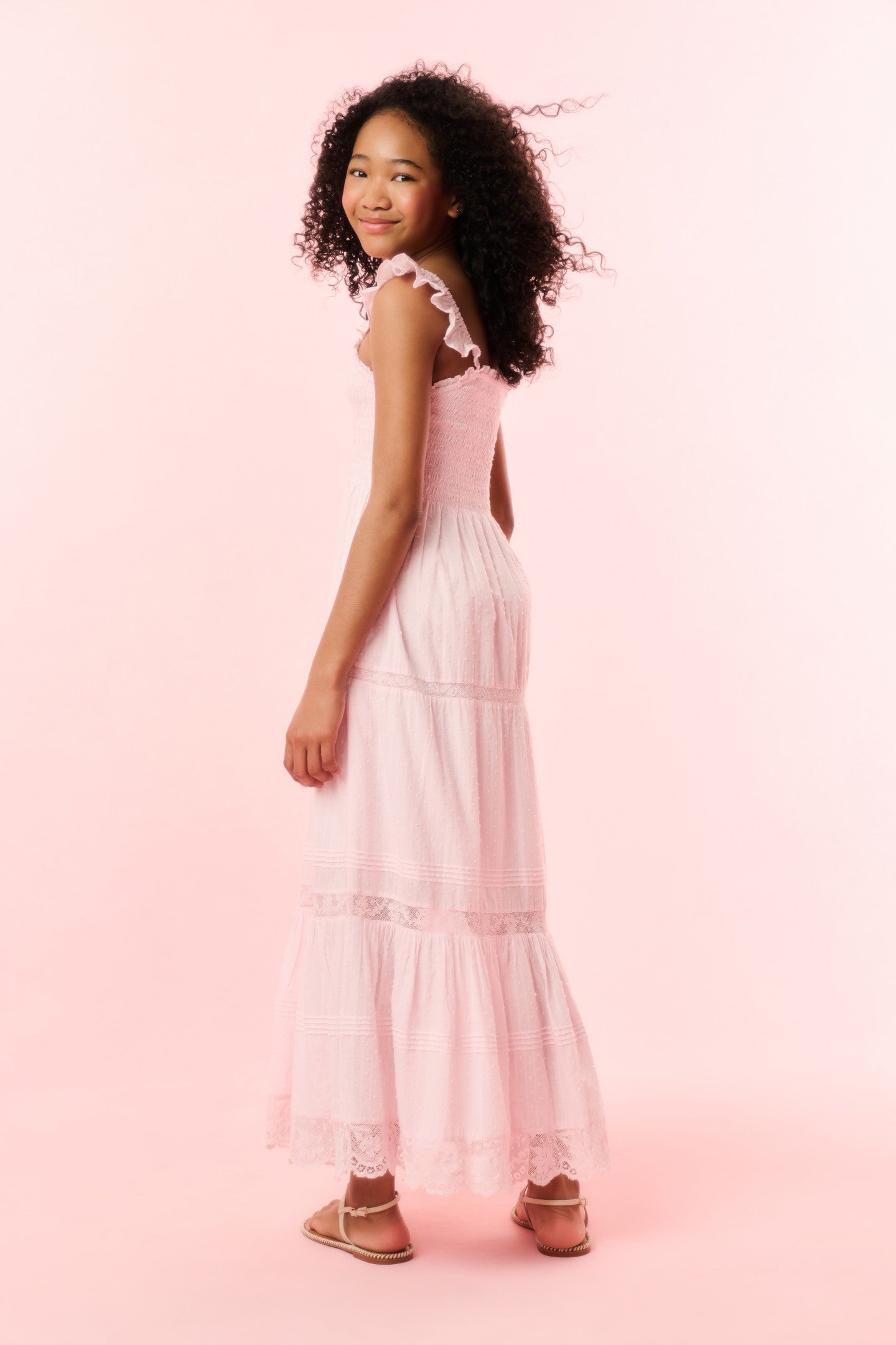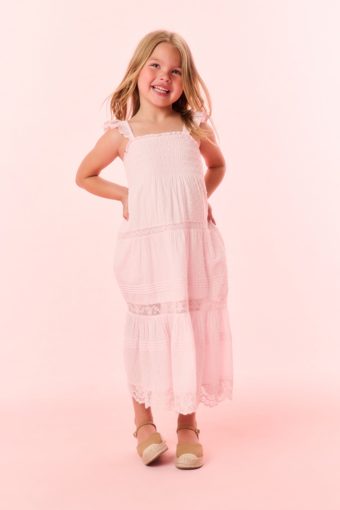 Introducing the Rhiannon Dress. This easy frock features tiny flutter sleeves, a square neckline, lace trims throughout, and an airy, flowy silhouette.