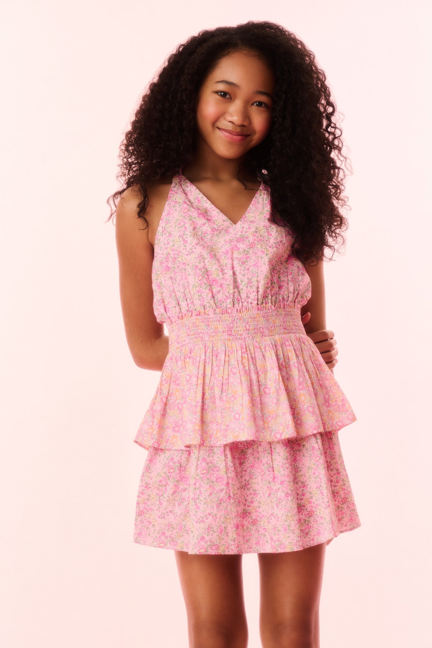 Our best-selling Romille Dress for our littles stuns with an airy cotton fabric. The dress begins with a v-neckline that falls to an elasticated waistband above a two-tiered mini skirt. The Primrose Charm color is Made With Liberty Fabric.