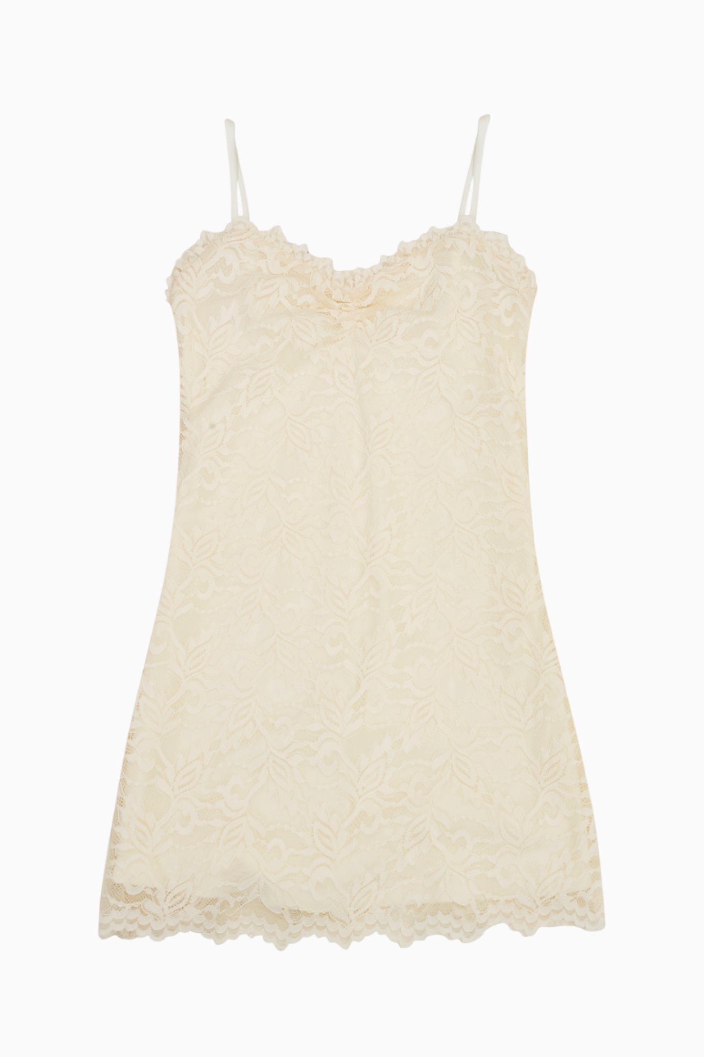 So sweet in the Siofra Dress. This pretty piece stuns with a lace-adorned fabric with scallop details, thin spaghetti straps, and a frayed neckline. The dress comes fully lined.