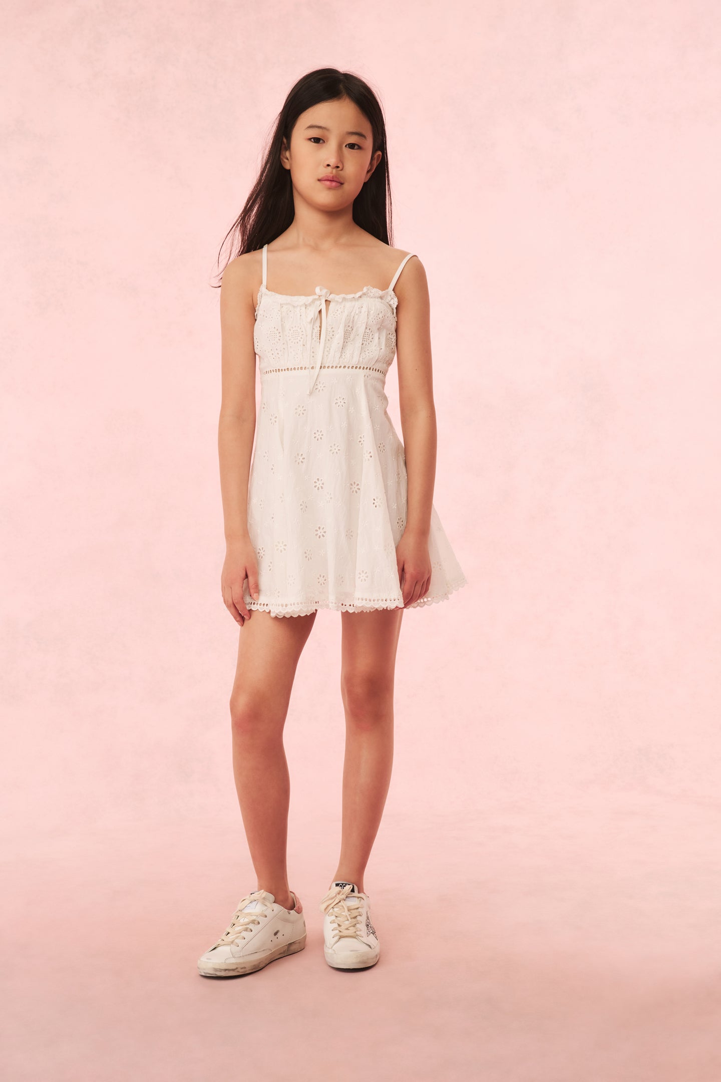 Dressed to impress in the Taralynn Dress. This pretty sun dress features a cotton fabric with intricate eyelet details all over. Easy and breezy, the piece features thin spaghetti straps, a keyhole with a self-tie detail at center front, and an airy skirt.