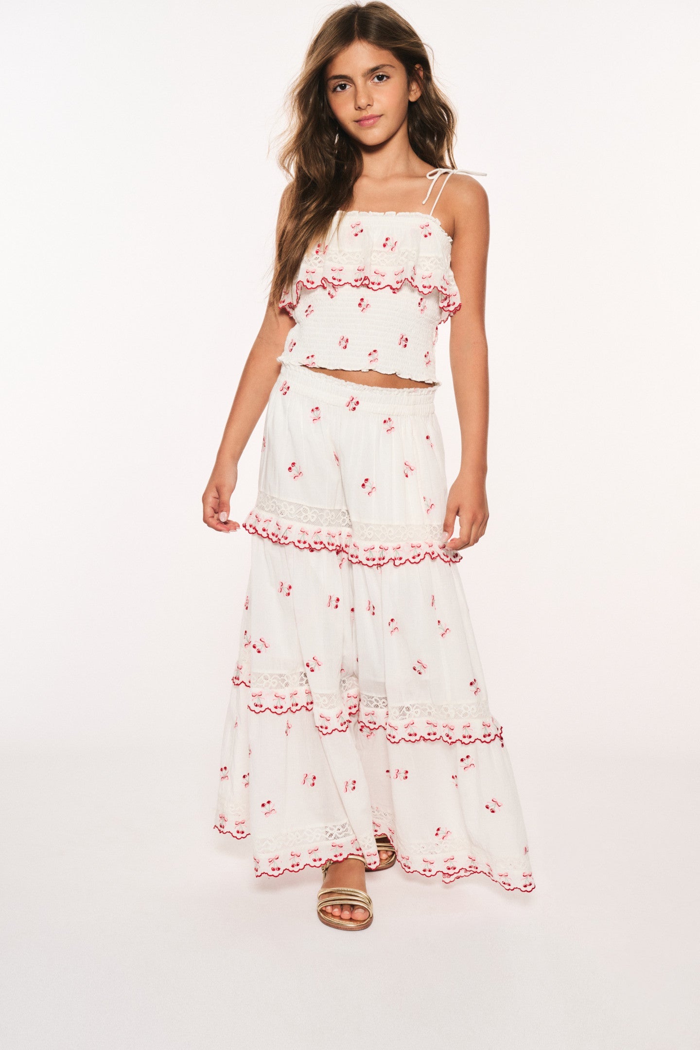 Introducing the Zinna Skirt as part of our America’s Sweetheart Cotton Collection. This sweet multi-tiered skirt debuts with printed cherries, scallop details, and an elasticated waistband for easy and comfortable wear.