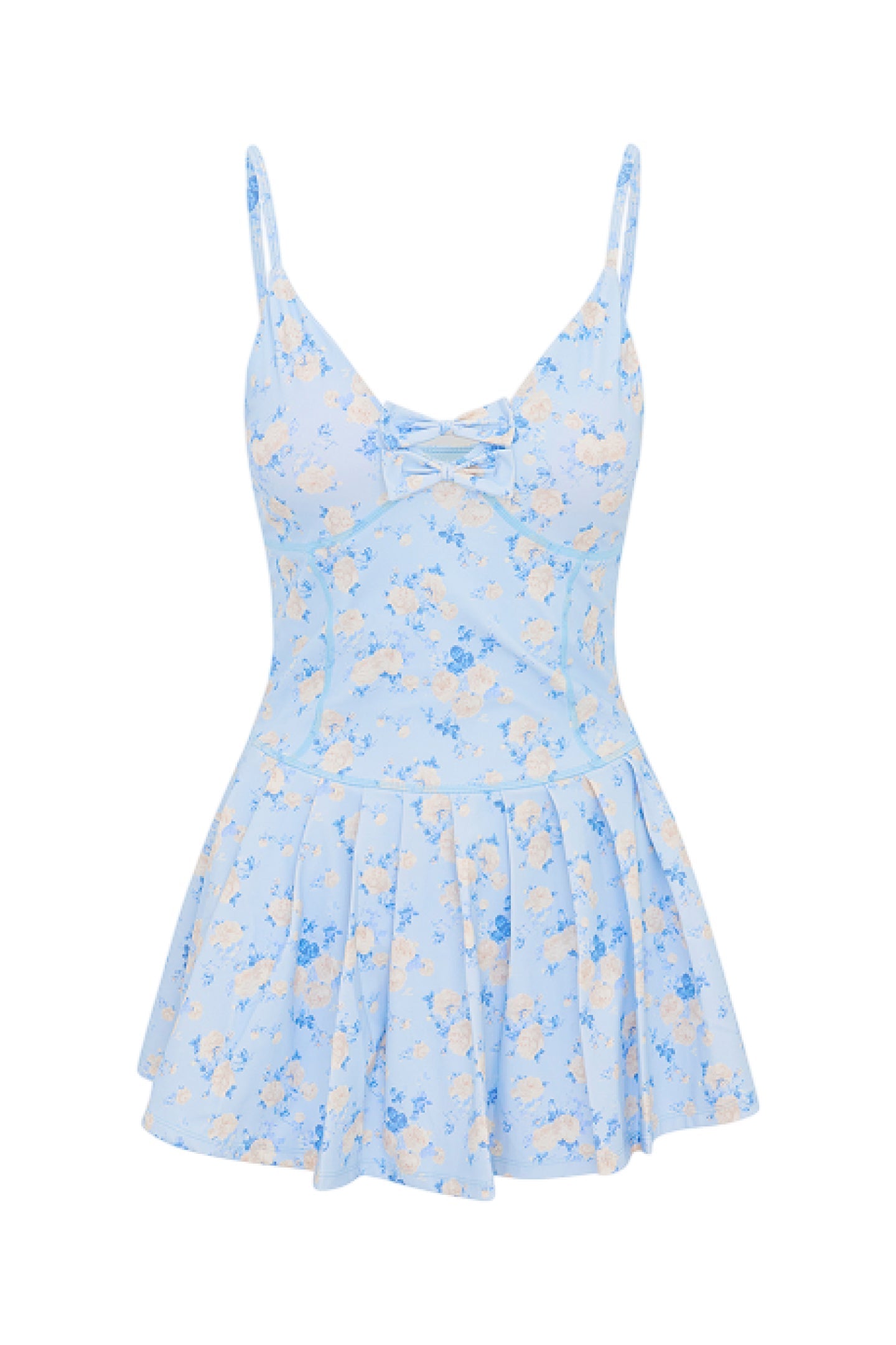 Game, set, mini. The Hubert Dress returns in our signature floral prints. Designed with a lightweight, breathable fabric, this active dress features built-in shorts for functionality, bra cups at the bust, functional pockets, princess and a center front seam. This sporty mini has thin spaghetti straps, a bow detail at center front, and an airy ruffle skirt.