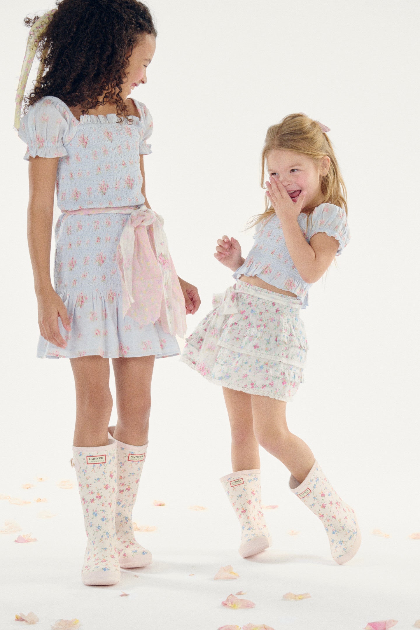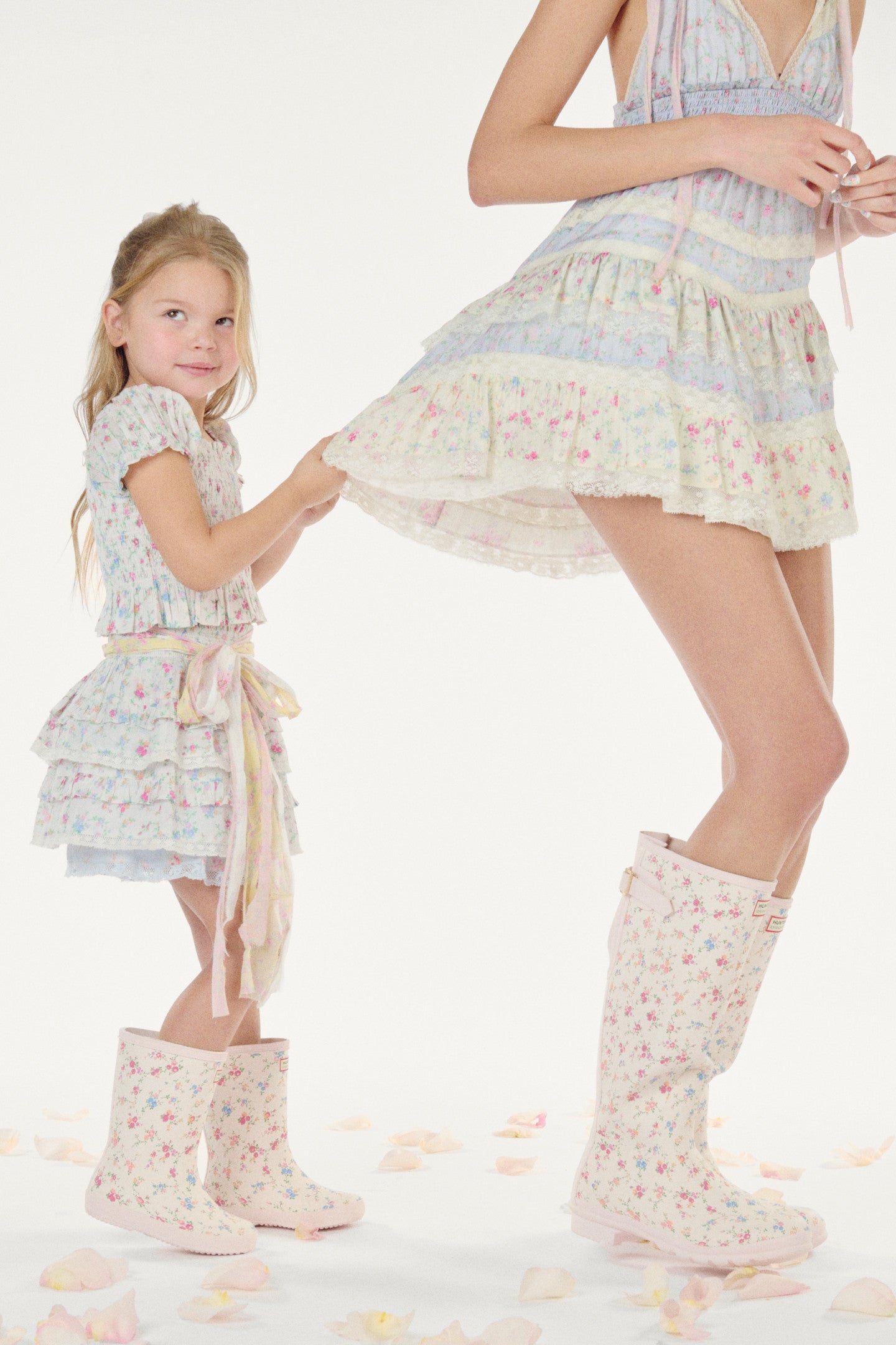 Hunter’s iconic Wellington Boots get the LoveShackFancy treatment with our signature prints with this limited-edition collaboration. The Kids First Classic rain boot is perfect for puddle splashing. Handcrafted from natural rubber, these fully waterproof boots have a flat outsole for stability and a rounded toe gives little toes room to move. Similar to the adults Original Boots, the specially developed tread on the calendered outsole reduces slipping and the soft recycled polyester lining ensures comfort. Little feet will be protected on any adventure, rain or shine.