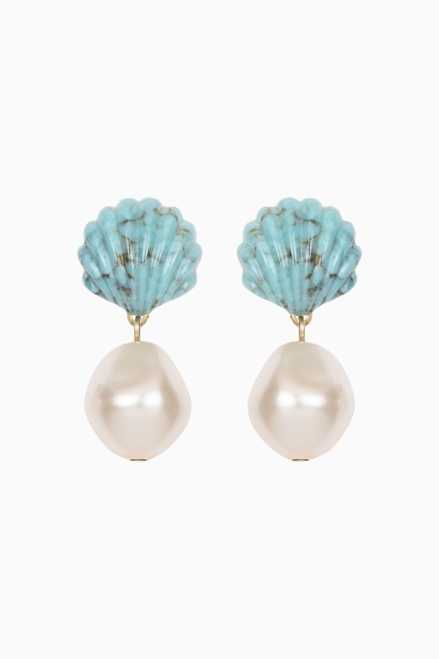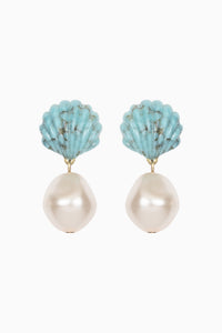 An unexpected finishing touch, the Nori Earrings find semi-precious turquoise formed by hand into scallop shells. Made by hand in New York, the stones are juxtaposed by a baroque-shaped crystal pearl drop. We love turquoise for the natural variations found in each stone, which means no two pairs are entirely alike.