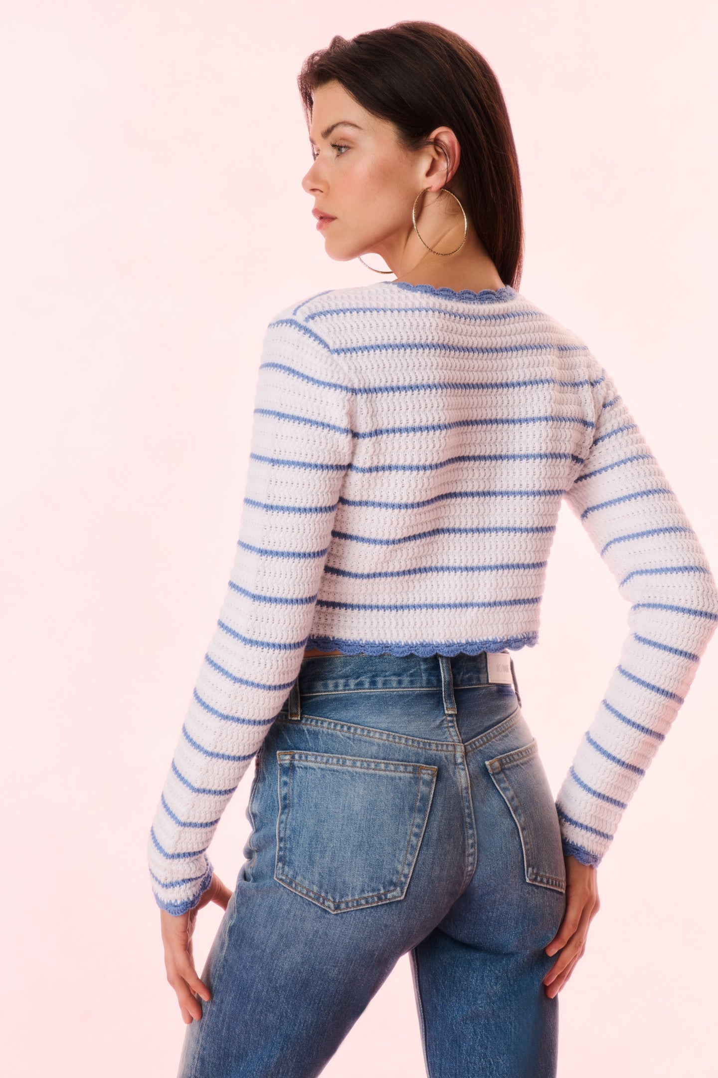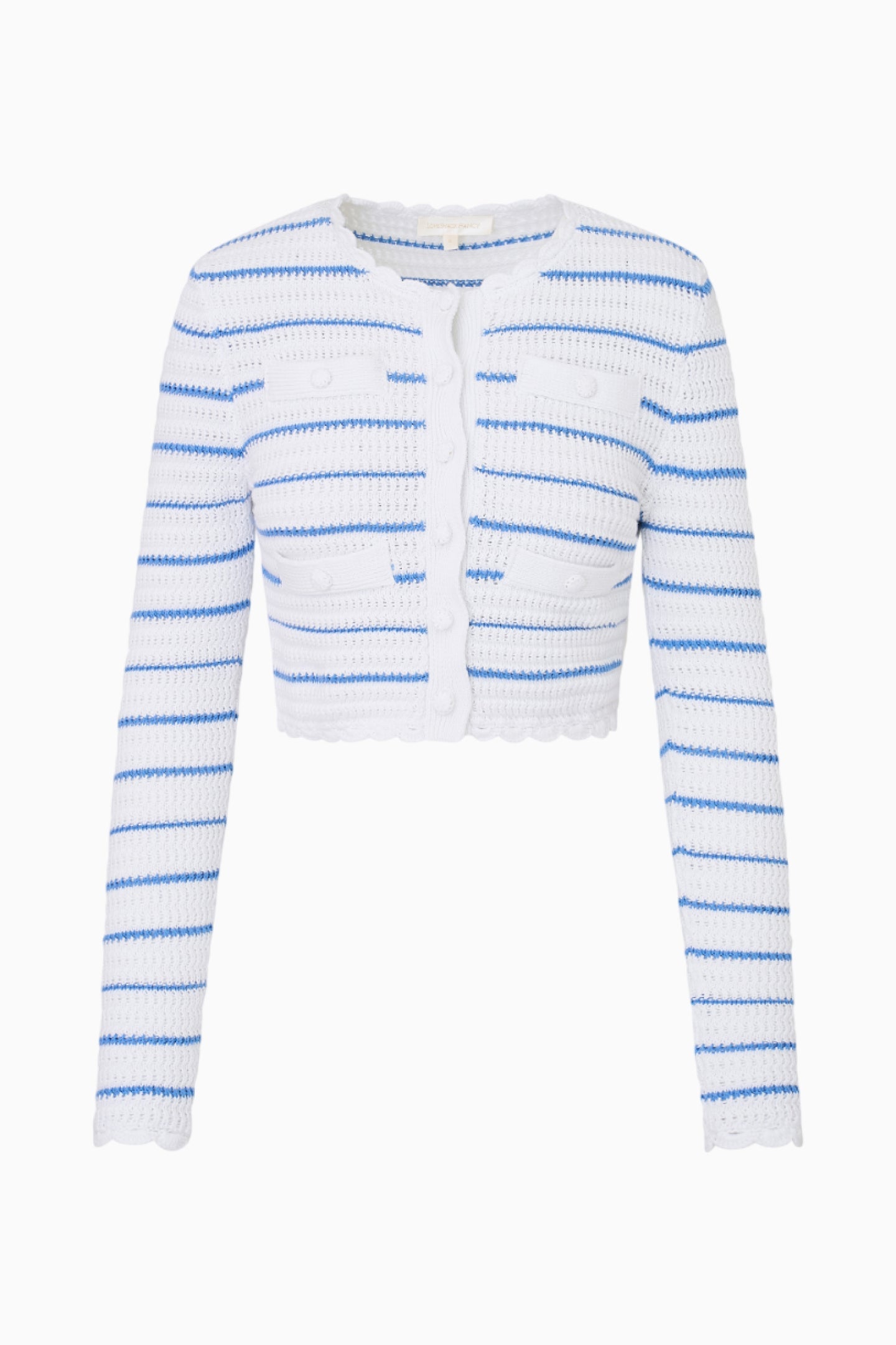 Seaside sweet in the Lamiya Cardigan. The charming cardigan arrives with a knit striped crochet fabric featuring crochet scallop trims throughout. This lightweight, cropped cardigan features crochet buttons down the front, faux pocket tabs applied on top, a placket with a full needle rib detail, and contrasting crochet scallop at the neck trim, bottom edge, and sleeves. Wear over the Lilibelle Dress for a matching set.