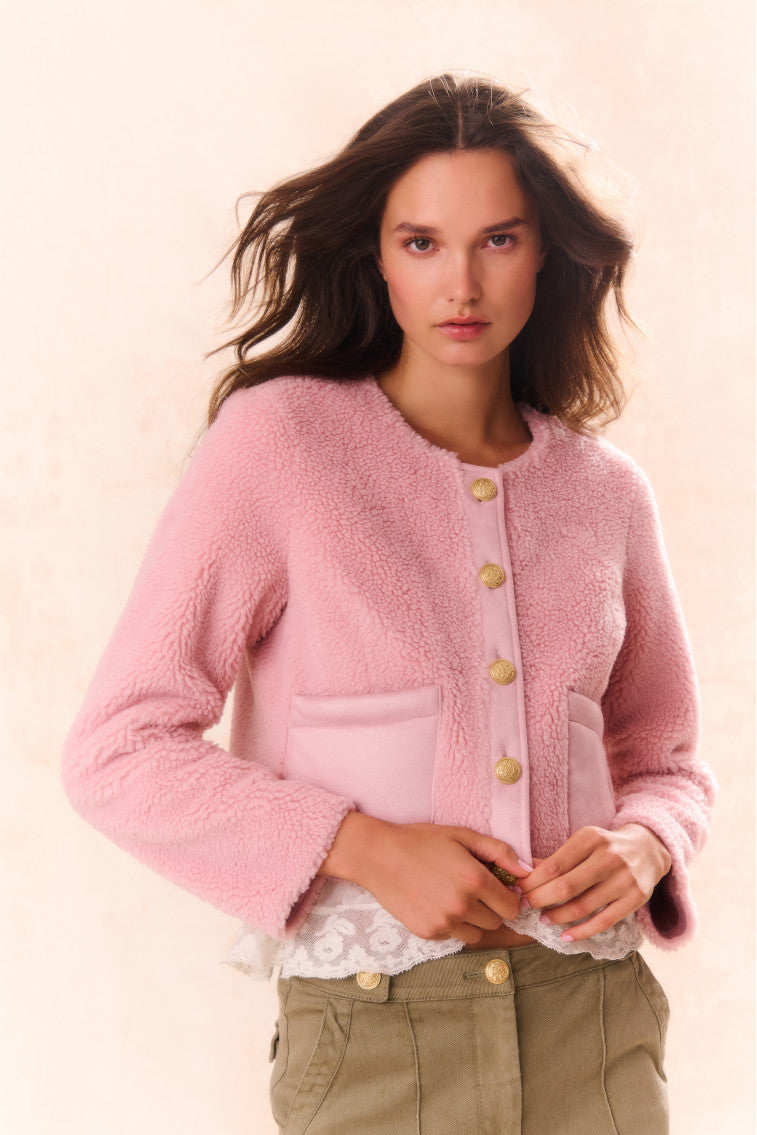Elevate your outfit with the Lully Jacket. This luxe layer is crafted from a short hair faux shearling mixed with faux suede details for a stunning contrast. The charming jacket has an easy pull on fit, gold military buttons down center front, and patch pockets at the front.