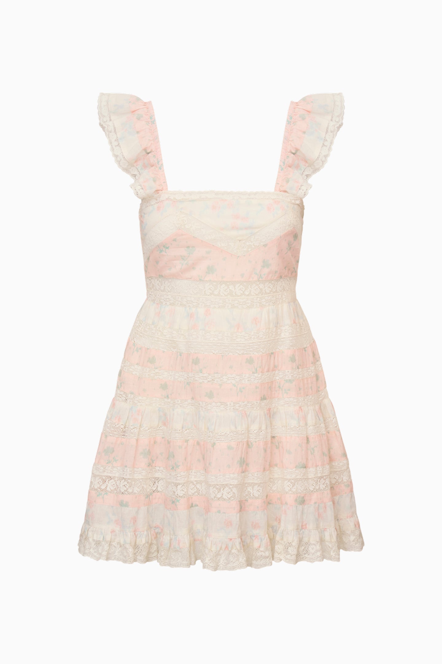 The Melitta Dress makes her dreamy debut designed from a cotton voile fabric with a pretty printed lace effect and intricate details like vintage-inspired laces stripped throughout. This Victorian-inspired piece begins with flutter sleeves, a straight neckline with chevron lace detailing at the bust, a sweet tiered skirt, and smocking at the back for ease and comfort.