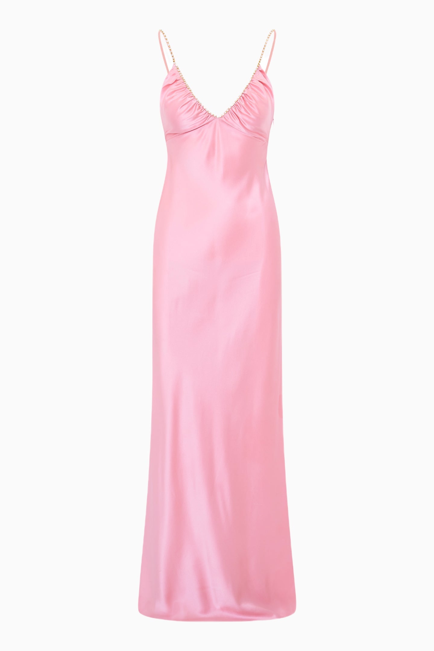 The Mystara Dress captivates with a touch of sparkle, cut in a fluid charmeuse for a slinky, luminous drape. This bias-cut maxi gown features an open V-neckline with delicate rhinestone trim tracing the straps, while soft ruching at the cups adds subtle romance. Effortless yet striking, this gown is designed to move with you, catching the light at every turn.