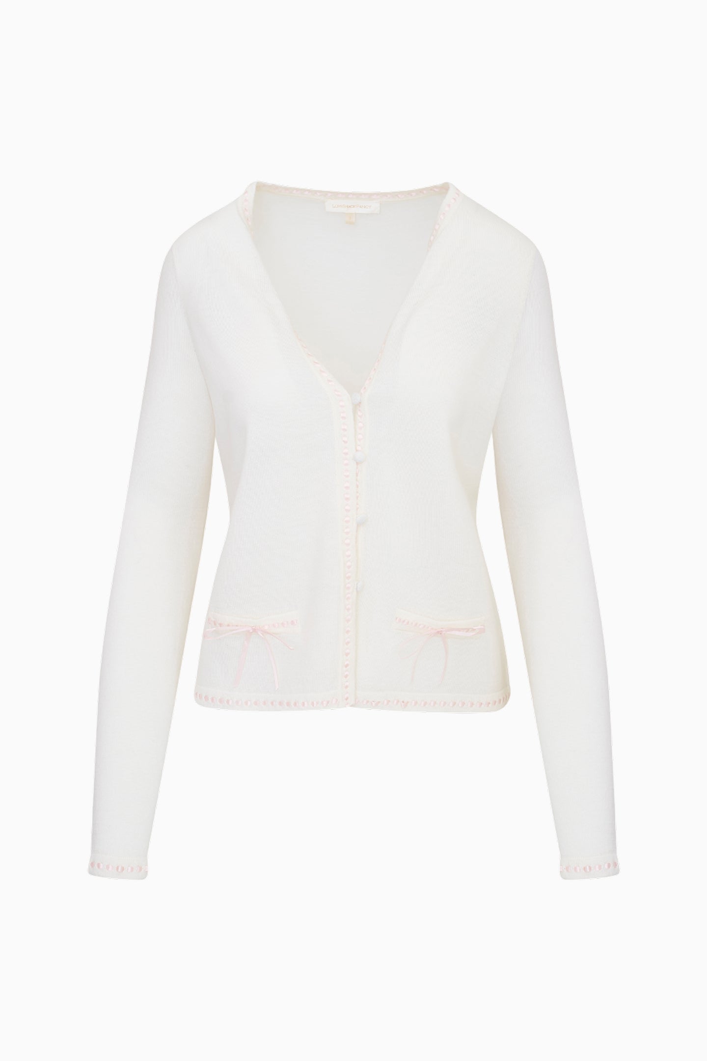 Introducing the Nessa Cardigan. This easy layer arrives in 100% Merino wool, pocket tabs with a satin bow detail. A jersey tubular satin ribbon is woven throughout while self-covered buttons adorn the center front with elastic loops on the front.
