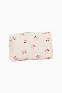 Our new Octavia Bag-in our whimsical, vintage-inspired cherry print-is the perfect clutch or cosmetic purse. It's quilted, soft and compact with a 3D bow. Zip closure at top.