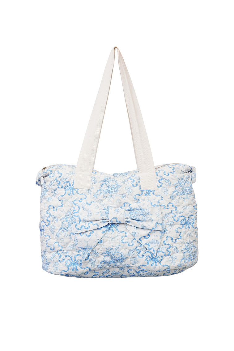 Our Oran Weekender is a LoveShackFancy favorite, reimagined in our whimsical, vintage-inspired bow print. This sizable duffle is quilted and soft with spacious construction, interior pockets and a zipper closure at top.
