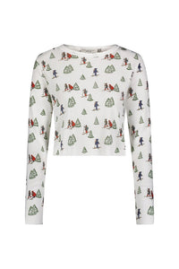 This crew neck long sleeve top with scallop neckline features a rib knit with natural stretch. The pre-washed British heritage knitting shows a custom ski print perfect for cozy winter nights.