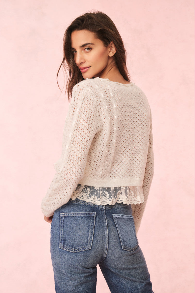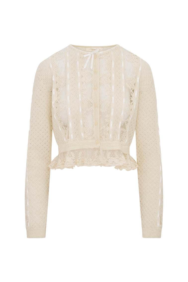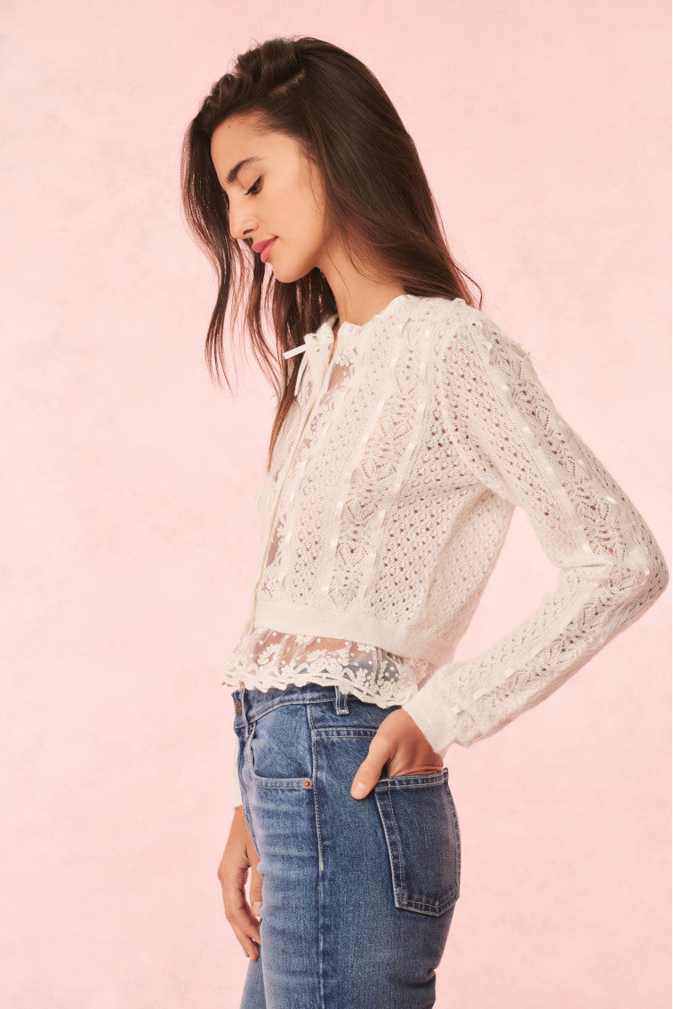 Introducing the Reneley Cardigan. This charming knit arrives in our warm, alpaca wool blend. Custom, vintage-inspired lace lines the peplum hem while inset lace also lines up vertically on the top. Contrasting ribbon is woven through the pointelle stitches for a spirited touch. Faux shell custom bow buttons descend down the center front. The top is completely sheer.