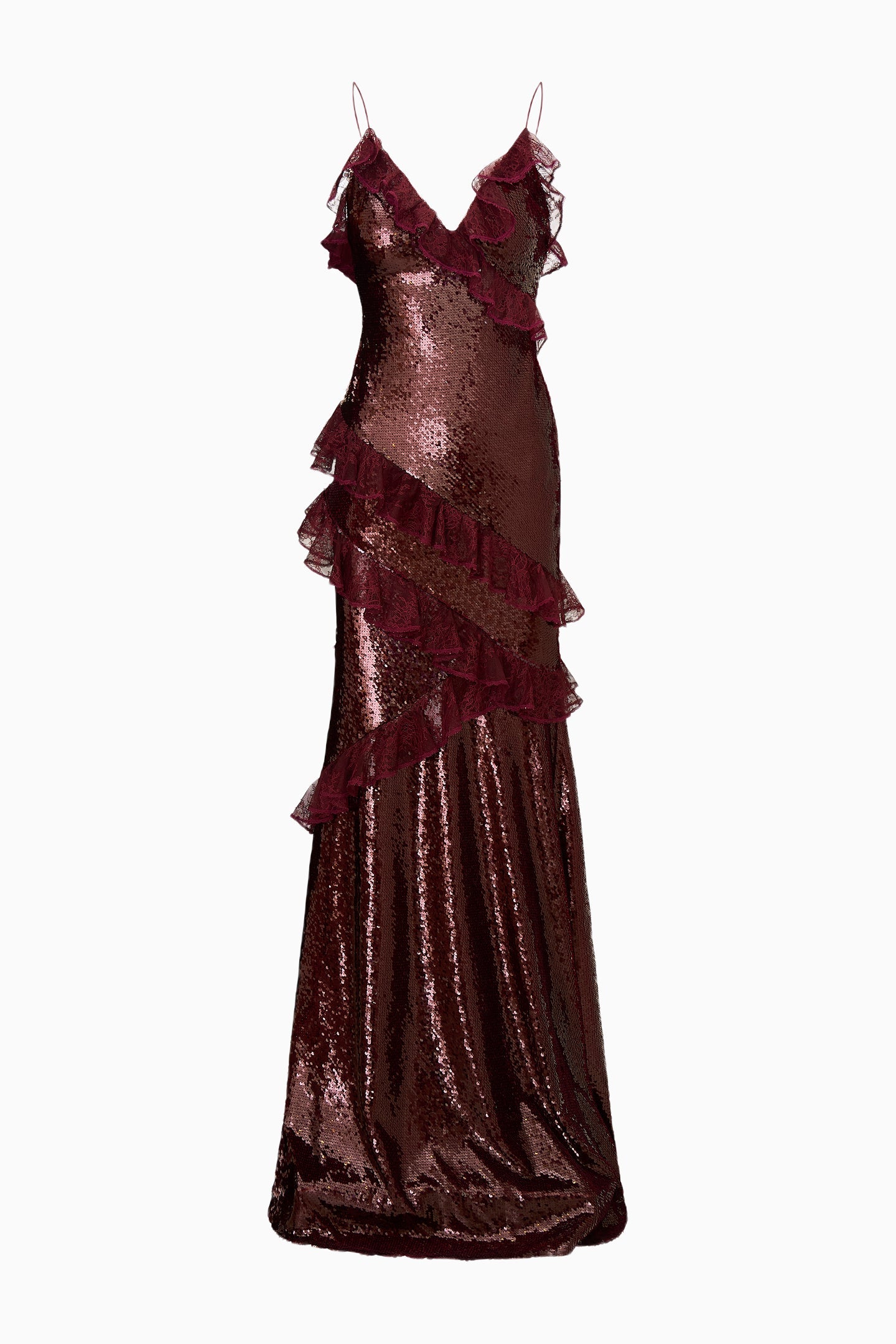 Our iconic Rialto Dress returns in show-stopping glimmer—now fully reimagined in a shimmering sequin fabric in a rich, wine-deep hue. The silhouette remains beautifully familiar: a slightly fitted bodice with a hidden side-seam zipper, ensuring it flatters in all the right ways. But this special edition is sprinkled with new intrigue—delicate lace ruffles are striped throughout, weaving romance into every shimmer. A statement-making piece, made for unforgettable nights.
