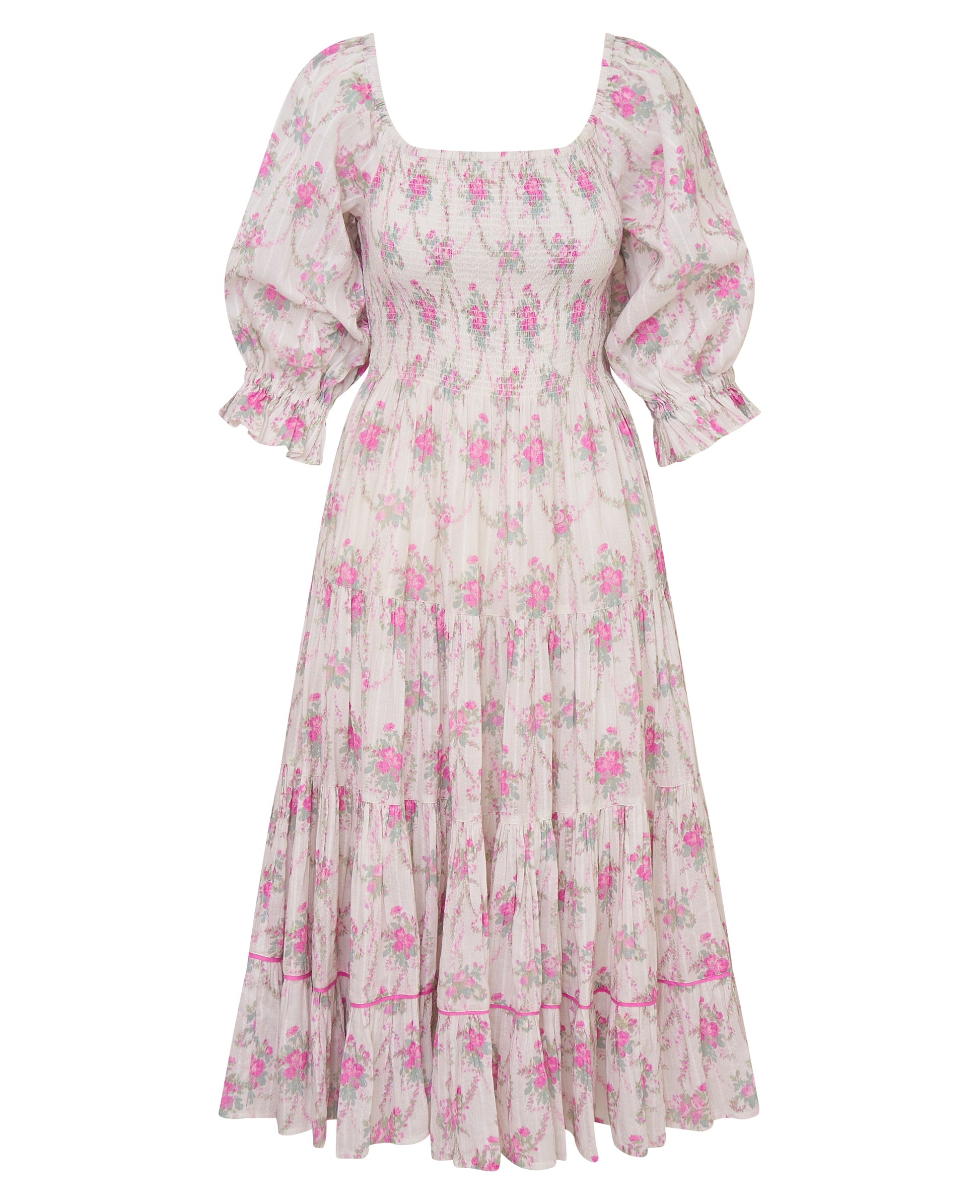 One of our original, beloved dresses returns with a pretty new print for the season. The Rigby Dress arrives with a flirty new floral all over. This sweepy midi dress features a dobby striped fabric for added texture, elastication at the sleeves so they can be worn on or off the shoulder, and a ruffle skirt that releases into shirred tiers.