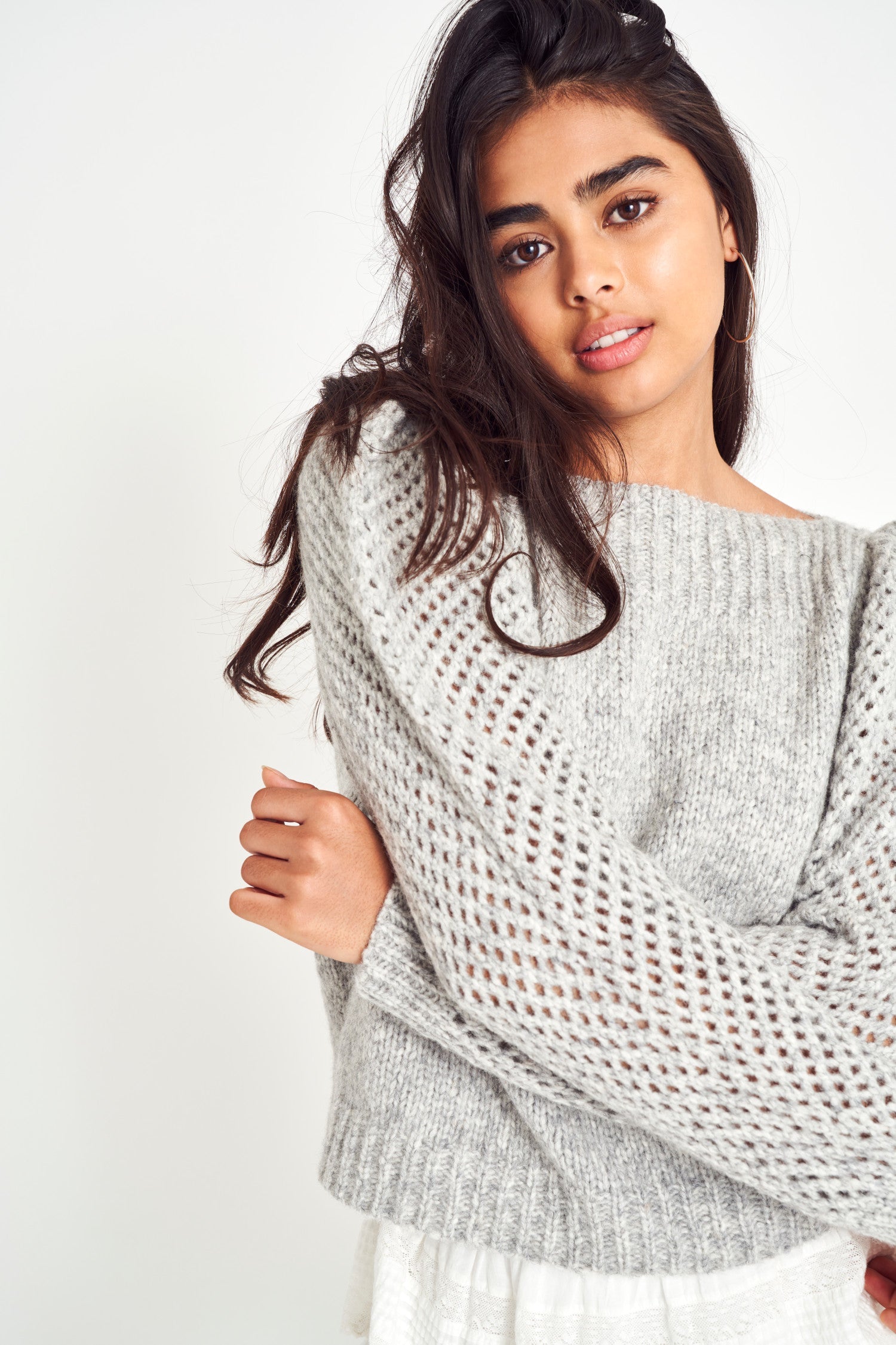 Our Rosie pullover is an instant favorite. Made from baby alpaca, this style is extremely light and fluffy whilst maintaining a chunky look. The pullover features a straight rib neckline and straight body with rib finishing. Added drama in the sleeves contrasts against the body, with an open-knit weave and puff in the shoulder that slims out towards the bottom. Pair it with one of our Ruffle Mini Skirts.