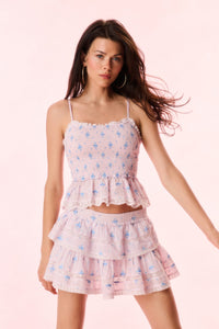 Our best-selling Ruffle Mini Skirt returns with a striped cotton voile fabric featuring a ditsy floral print all over. She features intricate inset lace trims and allover pintuck details. The elasticated waistband offers flexibility in comfort and styling. Tiered ruffles exude effortless femininity. The mini is finished with a frayed, raw hem for added playfulness.