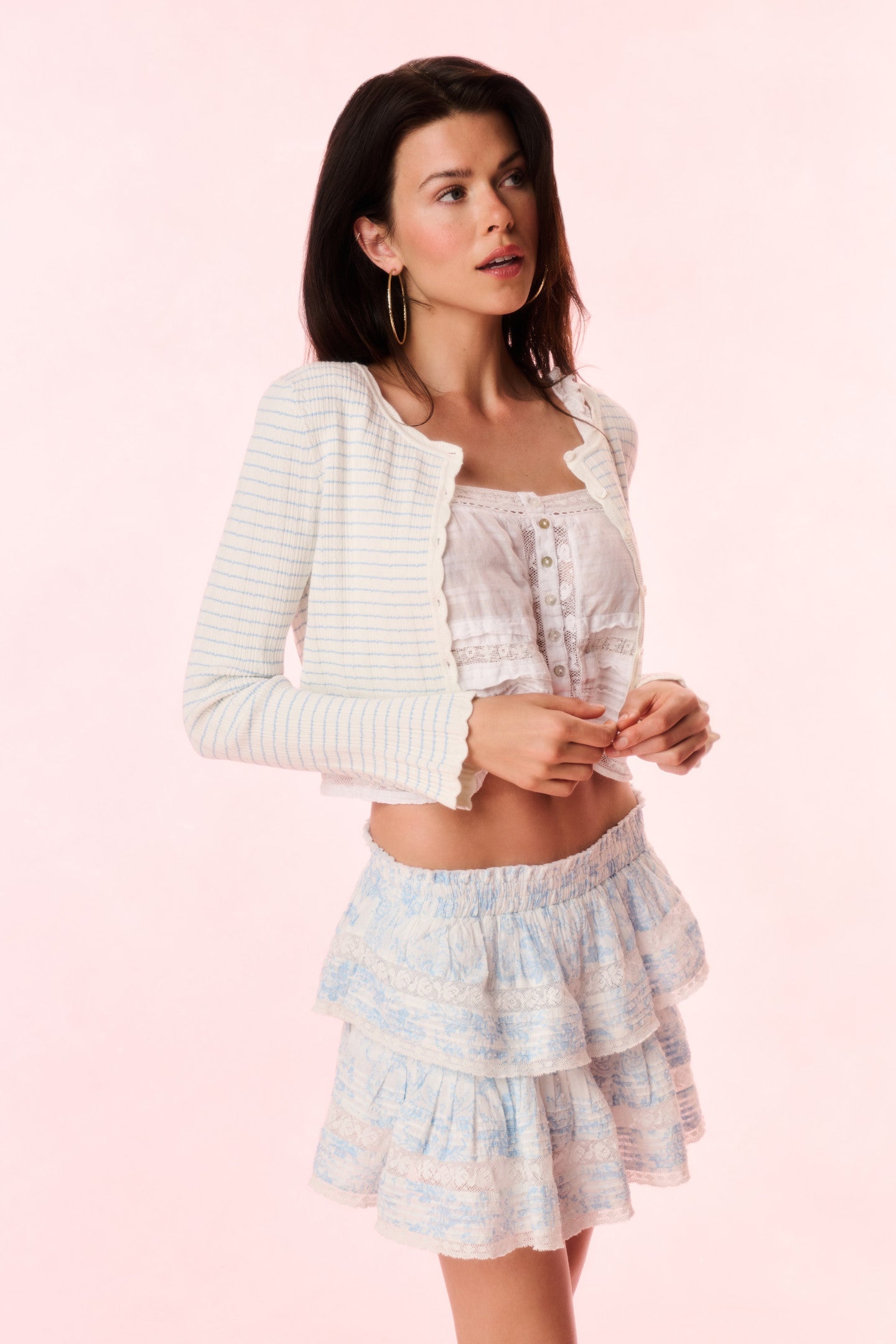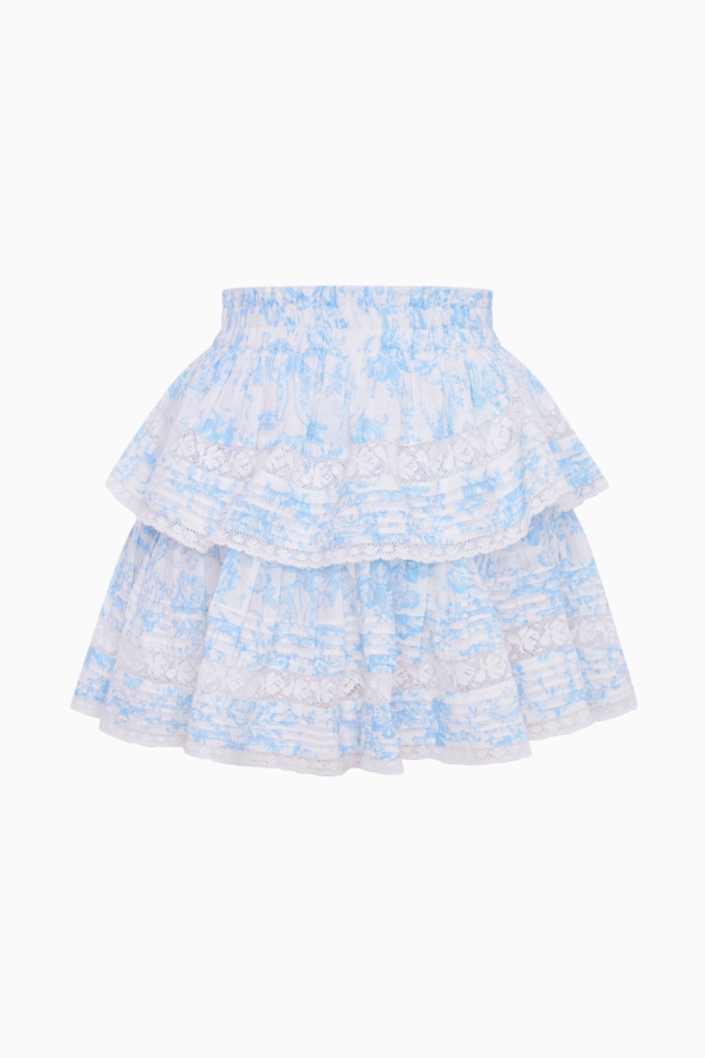 Our best selling Ruffle Mini Skirt returns for the season with a crisp cotton poplin fabric with an Italian-inspired bow print all over. She features intricate inset lace trims and allover pintuck details. The elasticated waistband and double lining offers flexibility in comfort and styling. Tiered ruffles exude effortless femininity. The mini is finished with a frayed, raw hem for added playfulness.