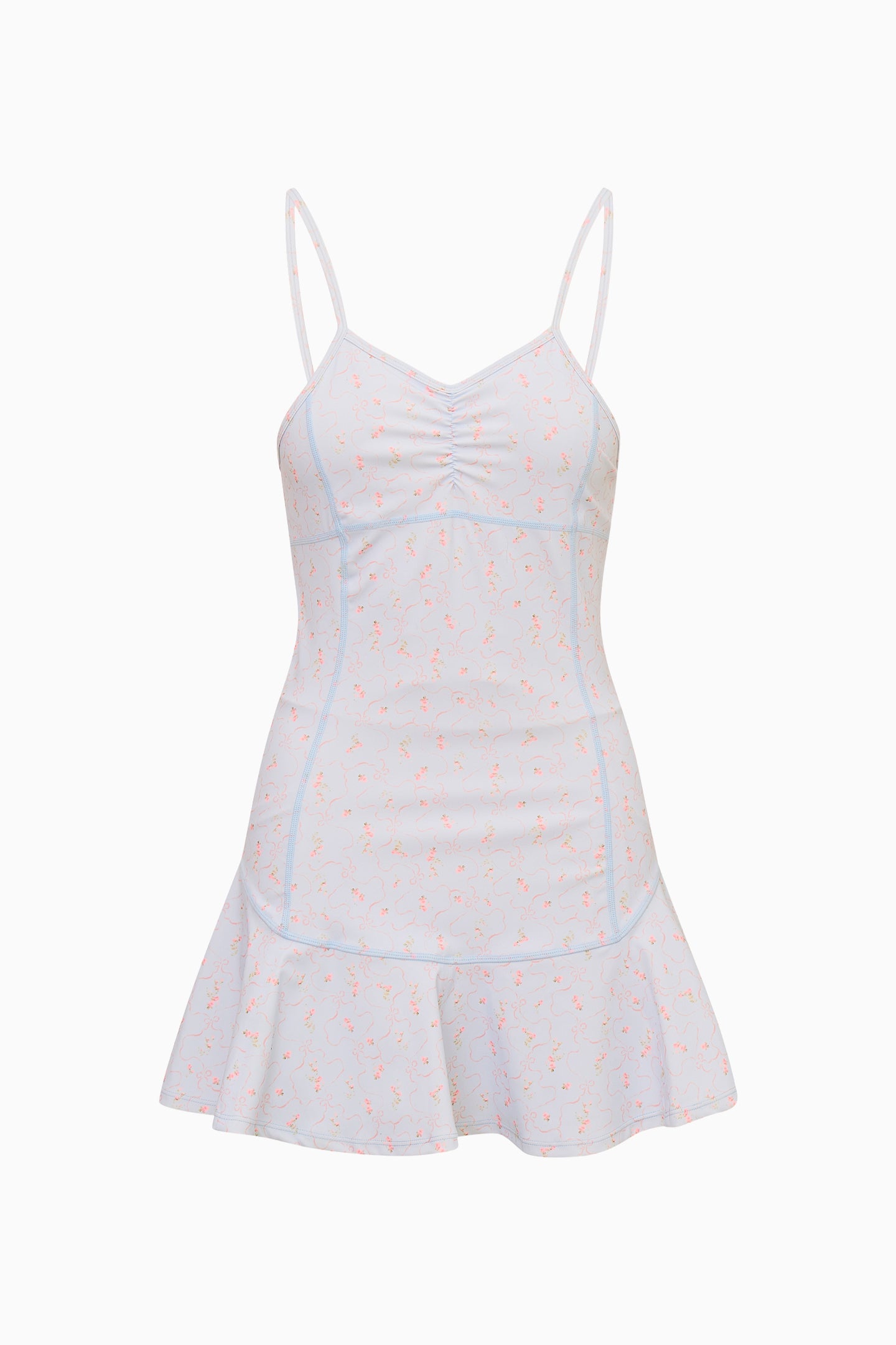 Our newest active-meets-feminine silhouette, the Sylvie Dress, is made for movement with a romantic twist. Designed with delicate spaghetti straps (fully adjustable) and shirring at the center front, she features cover stitch detailing along princess and empire seams for a flattering fit. A lower waistline gives way to a sweet, flounced hem, while the built-in jersey lining, breathable mesh, and interior shorts with pockets make her as functional as she is charming. Complete with removable bust cups for customizable comfort — perfect for court days, coffee dates, and everything in between.