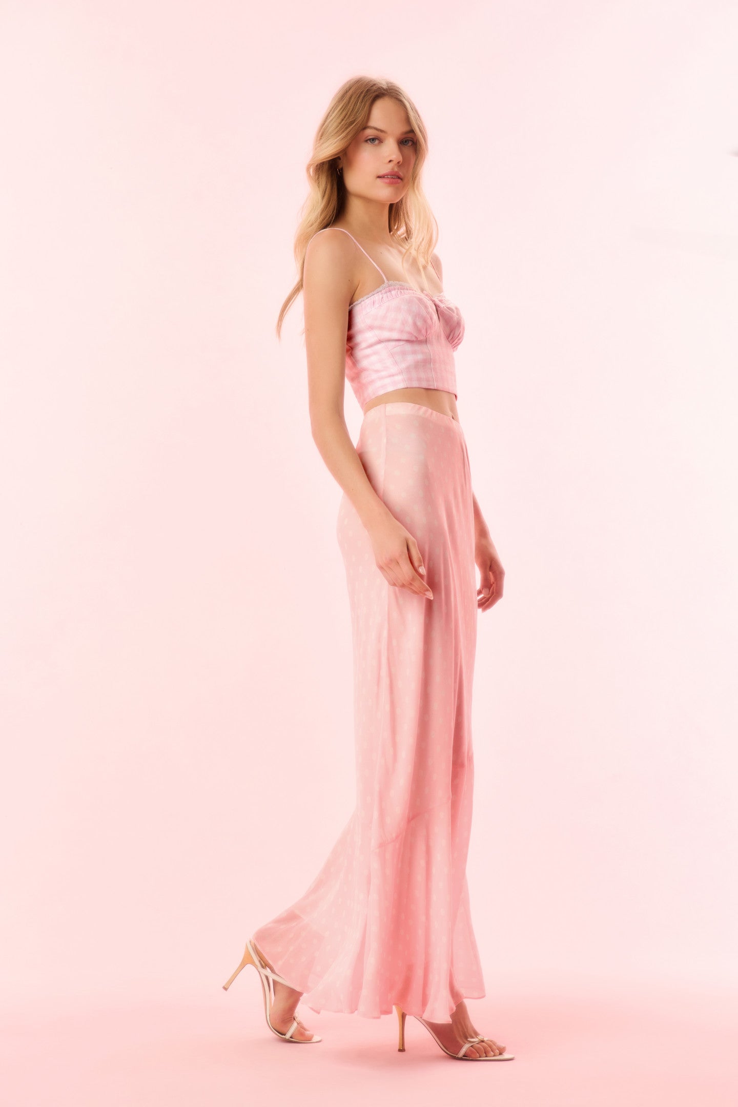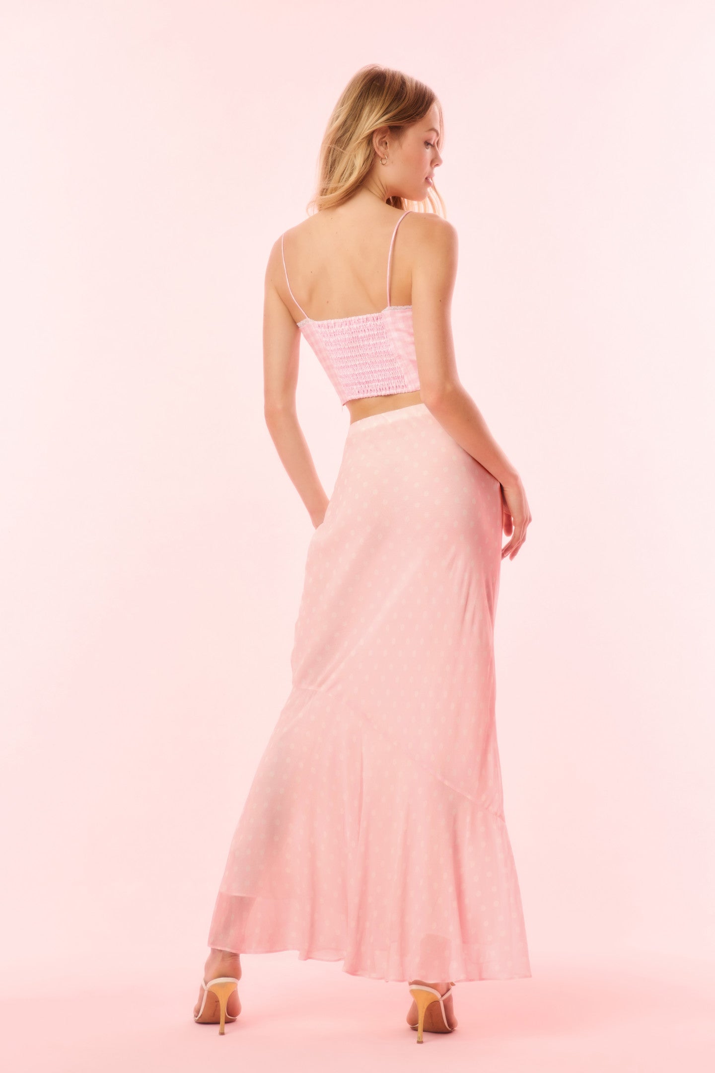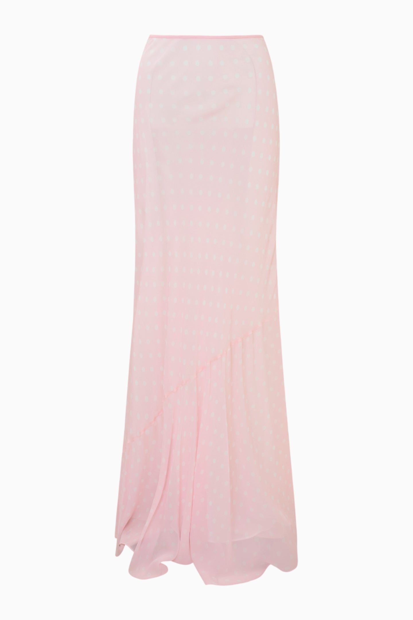 Introducing the Tesleigh Skirt. Arriving in a lightweight viscose chiffon fabric, this pretty maxi skirt features an Italian-inspired polka dot print. Flirty and feminine, the evening piece has a mermaid silhouette with a slightly slim fit, and a fixed waist.