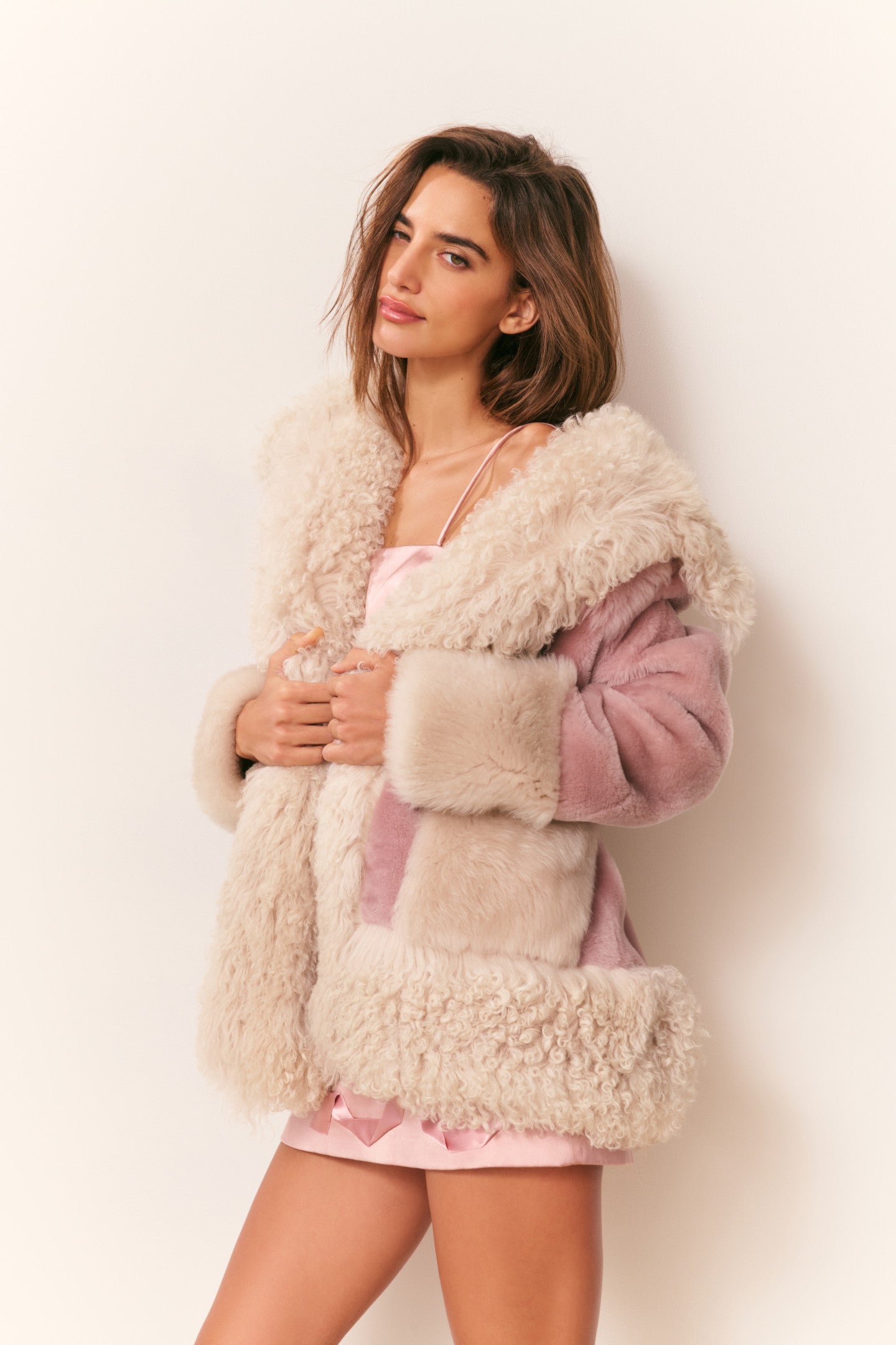 The Tuskara Jacket is a 70s-inspired, bohemian statement piece crafted in luxurious lamb shearling. A patchwork of varying lengths creates a playful medley of pinks and creams, with the longest shearling accenting the collar and hem. Hitting at the upper thigh, it features full-length sleeves, patch pockets, and fur hook-and-eye closures for a fashion-forward, cozy finish.
