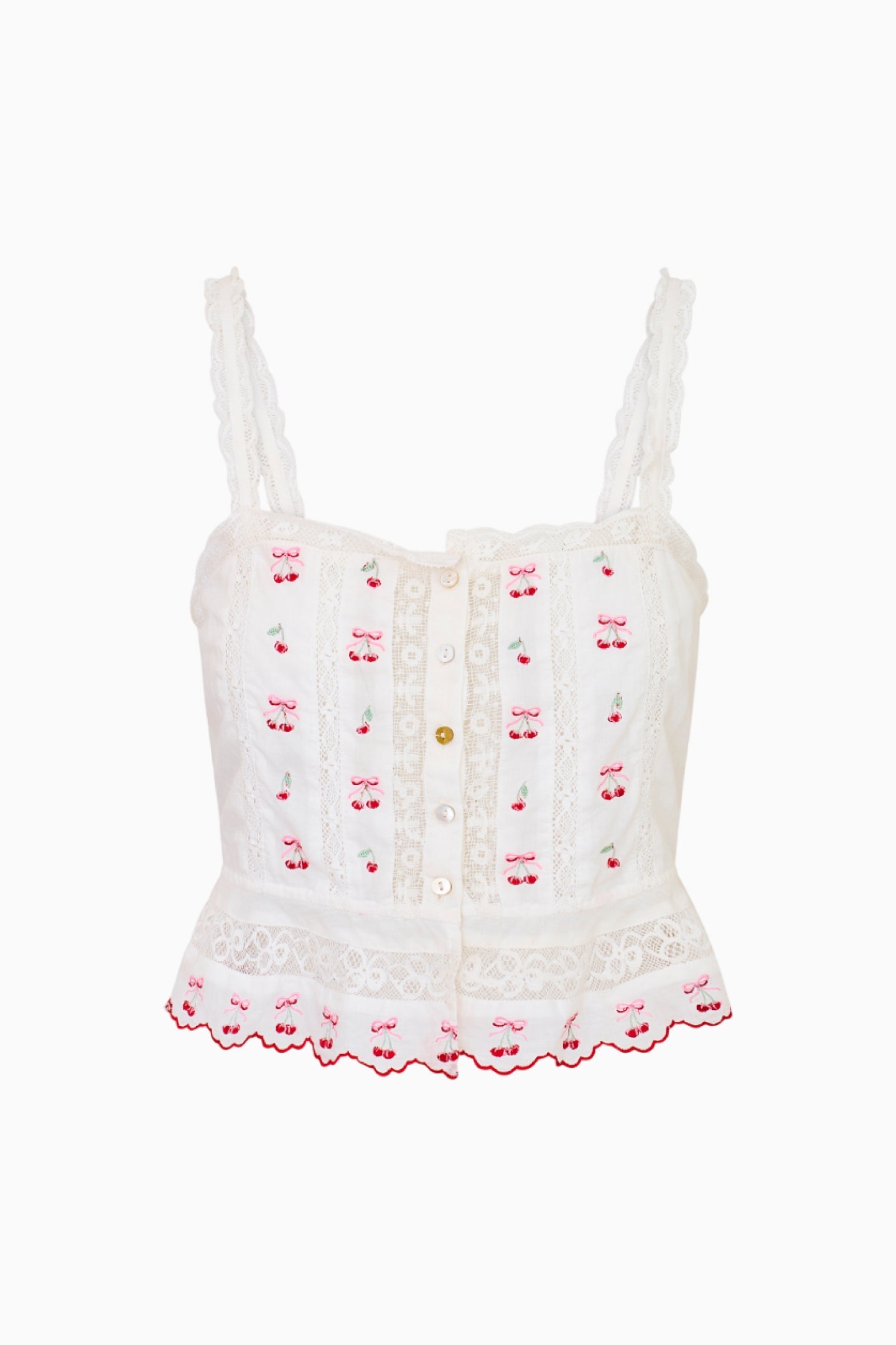The Vietta Top returns as part of our America’s Sweetheart Cotton Collection. This charming top debuts with dancing cherry embroideries all over and a custom developed scallop hem detail. This fitted, Victorian-inspired cami top comes cropped with a center front placket designed with intricate laces all over and floral embroidery detail. The piece features thin straps, a square neckline, buttons down center front, and a flirty peplum hem.